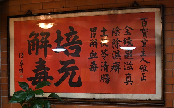 牆上掛有中醫(yī)伍卓琪親撰古方龜苓膏功效的題字。