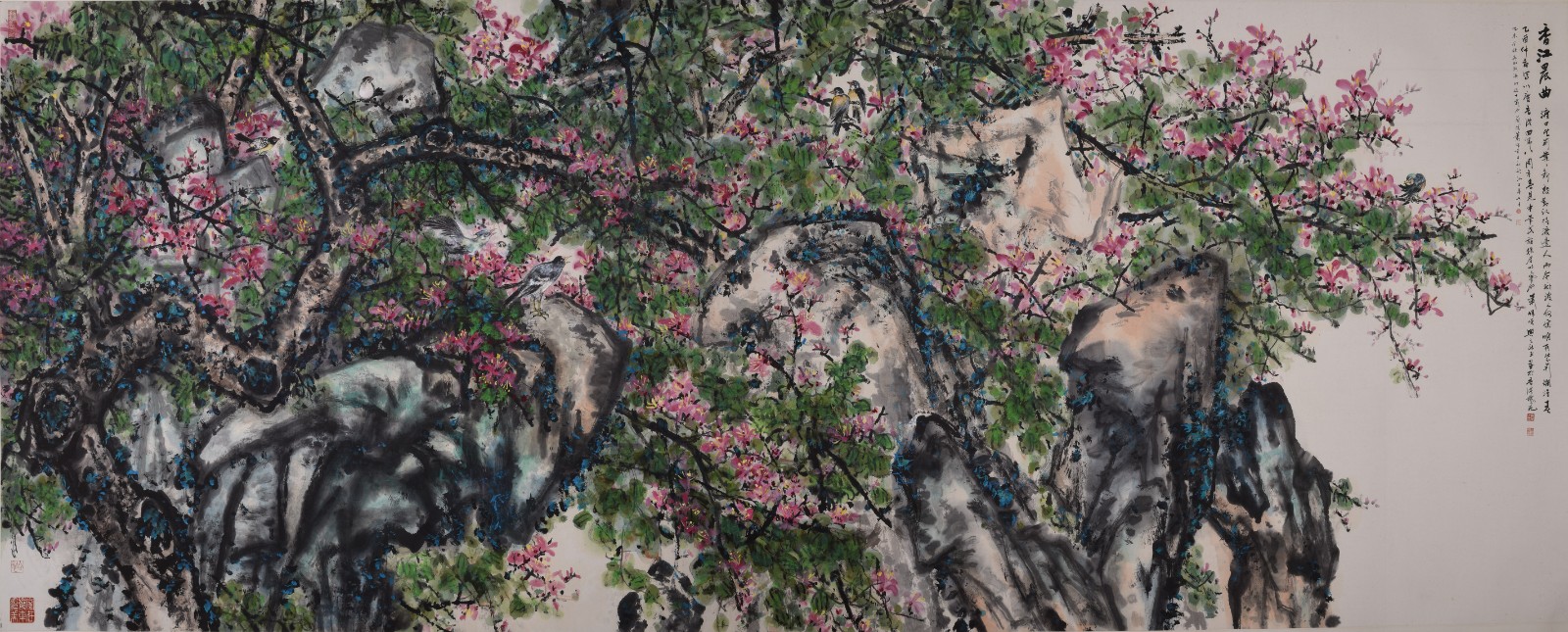 蕭教授的畫飽含熱情,如同他對祖國的滿腔熱忱一般濃烈。畫中紫荊花迎春怒放,欣欣向榮,構(gòu)圖盈滿而不呆板,色彩絢麗而不妖俗,煥發(fā)著蓬勃的生機。其作品包涵了中國畫的底蘊和修養(yǎng),在傳統(tǒng)書畫的學習上功底深厚,他以書法入筆,力透紙背,蒼勁又不失靈氣;同時又具有鮮明的地域特點和個人風格,嶺南地區(qū)溫暖濕潤,花草豐茂,四季不乏明豔的色彩,而香港的中西方文化又碰撞出了令人耳目一新的繪畫技巧。蕭教授的畫中能看到如同油畫般的筆觸和厚重肌理,兩種截然不同的繪畫系統(tǒng)在他的作品中巧妙地結(jié)合起來,在水墨畫的創(chuàng)新上達到了更高的境界。