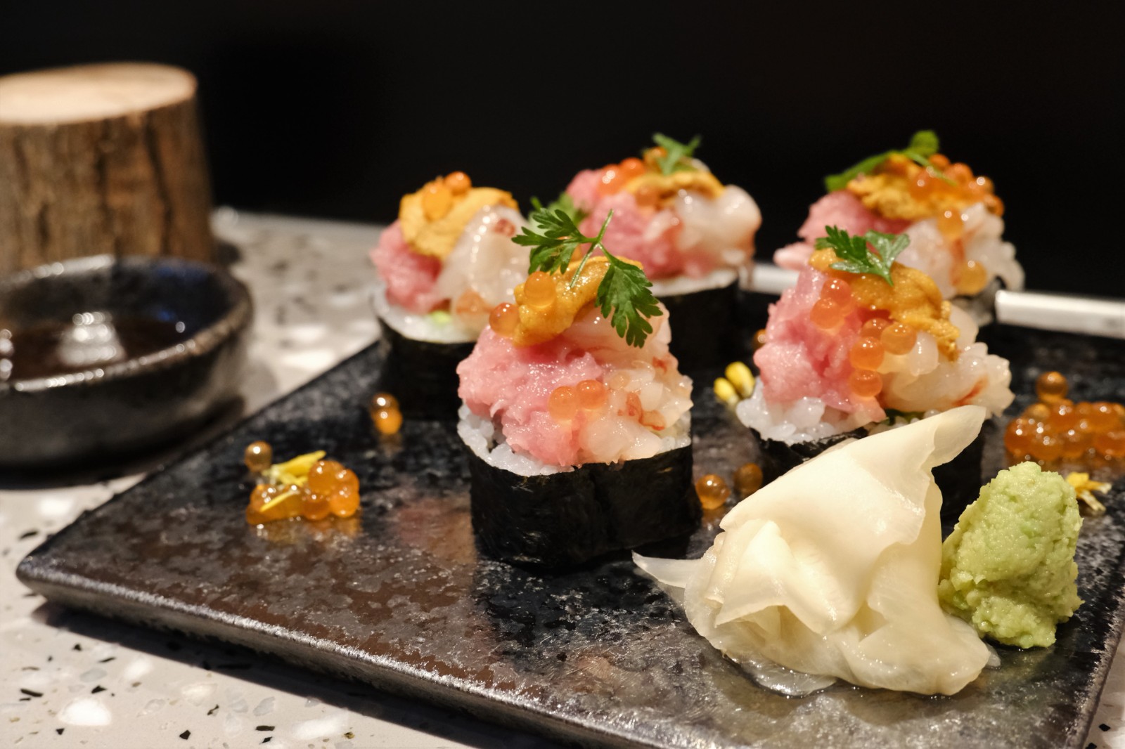 贅沢卷,HK$238。卷物包裹吞拿魚(yú)腩蓉、赤海蝦和海膽,三文魚(yú)籽,滿鋪碟上,十分足料。