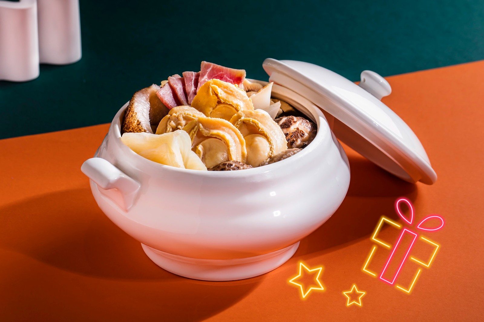 迷你佛跳牆採用智利鮑魚、中東海參、花膠,配以肉厚的花菇與瑤柱。