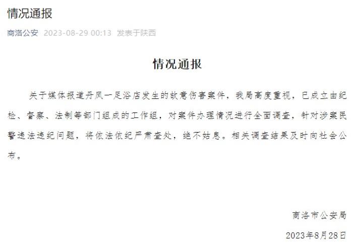 近日,「陝西商洛車管所一民警酒後在足浴店毆打殘疾工作人員」一事引發(fā)網(wǎng)友廣泛關(guān)注。對此,商洛市公安局29日在官方微信公眾號發(fā)布情況通報(bào)稱,關(guān)於媒體報(bào)道丹鳳一足浴店發(fā)生的故意傷害案件,商洛市公安局高度重視,已成立由紀(jì)檢、督察、法制等部門組成的工作組,對案件辦理情況進(jìn)行全面調(diào)查,針對涉案民警違法違紀(jì)問題,將依法依紀(jì)嚴(yán)肅查處,絕不姑息。相關(guān)調(diào)查結(jié)果及時(shí)向社會公布。