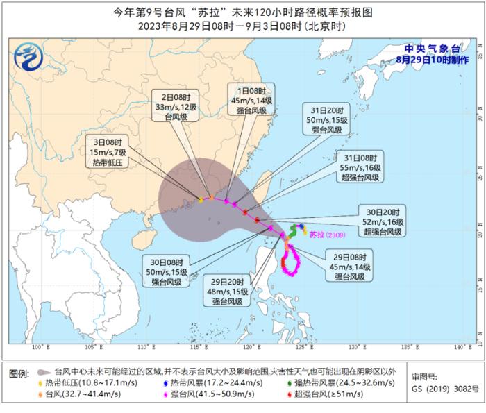 大風(fēng)預(yù)報(bào):8月29日14時(shí)至30日14時(shí),巴士海峽、臺(tái)灣海峽、臺(tái)灣以東洋面偏南海域?qū)⒂?-8級(jí)、陣風(fēng)9-10級(jí)的大風(fēng),其中巴士海峽海域風(fēng)力可達(dá)9-10級(jí),部分海域風(fēng)力可達(dá)11-13級(jí),「蘇拉」中心經(jīng)過的附近海面的風(fēng)力有14-16級(jí)、陣風(fēng)17級(jí)及以上,請(qǐng)過往船隻注意航行安全。