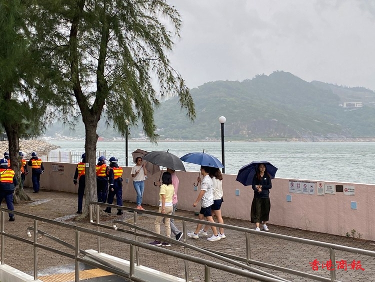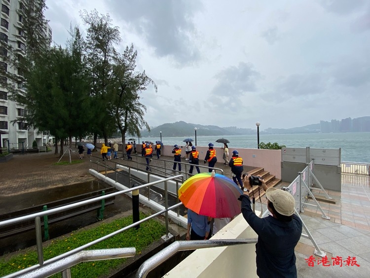 海旁有10多名民安隊(duì)人員不斷用揚(yáng)聲器勸籲市民離開,市民打完卡後便散去,但隨即有另一批市民來(lái)到,每批約10多、20人。民安隊(duì)背上全副裝備、身上背有救生繩索、緊急救護(hù)箱,在海旁來(lái)回巡邏。隊(duì)長(zhǎng)現(xiàn)場(chǎng)訓(xùn)示隊(duì)員要留意每棵樹木有否裂痕和響聲,察看大廈窗戶有否搖搖欲墜。