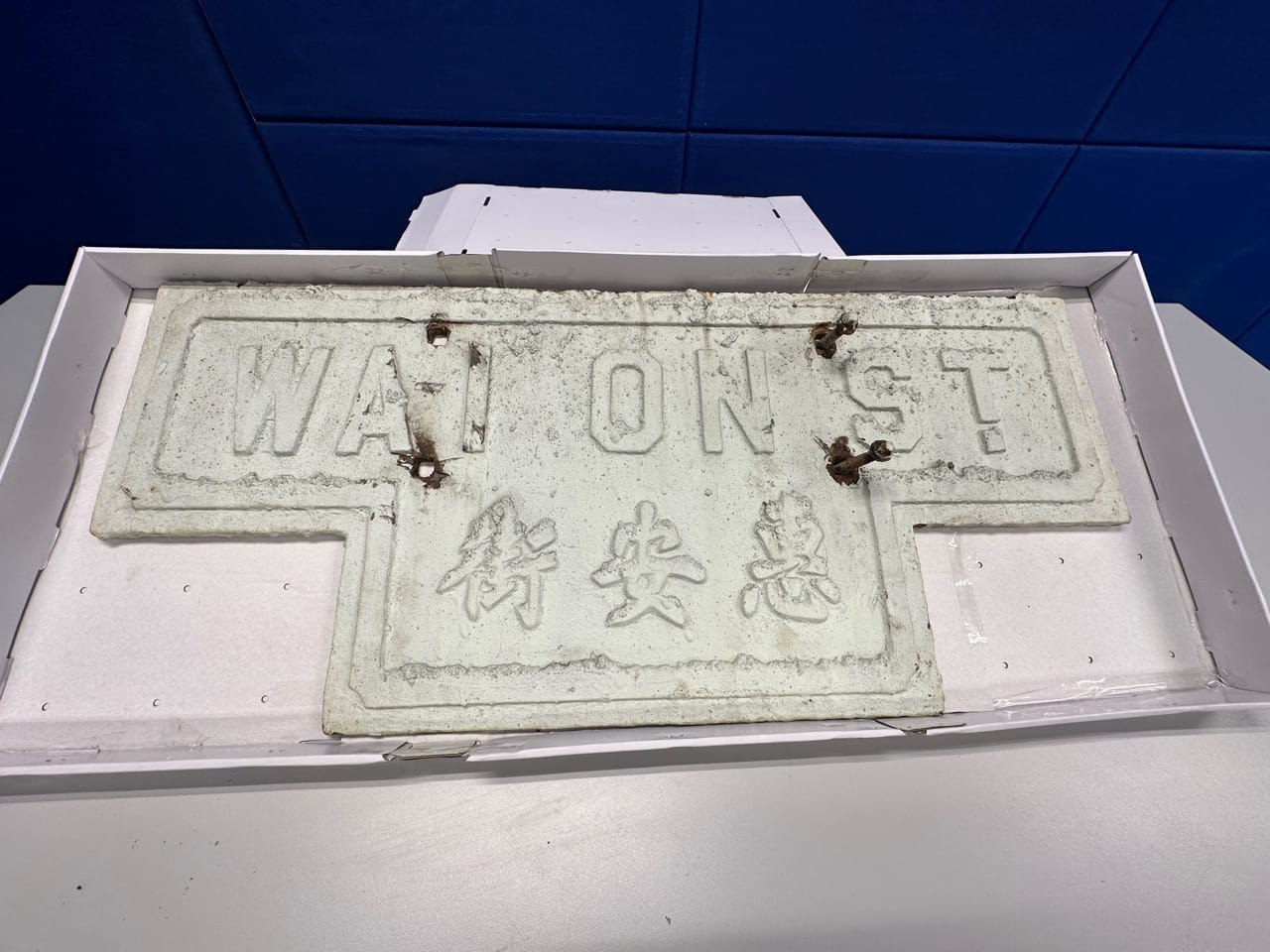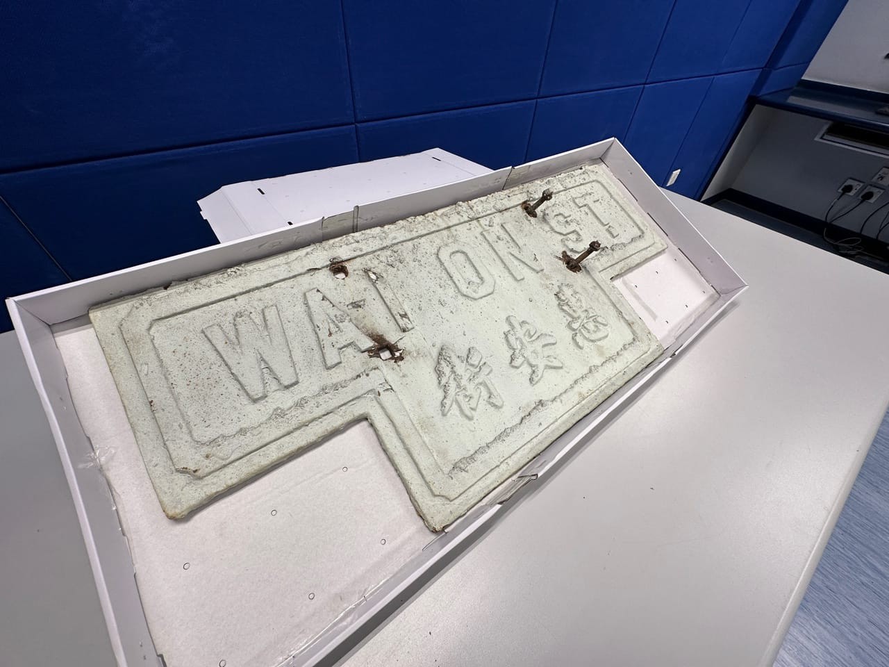 警方昨日(4日)根據(jù)線報和情報分析,在深水埗福華街一幢唐樓大廈的天臺,尋回一塊被盜的路牌,有理由相信因警方早前的拘捕行動後,賊人將路牌棄置於上址。韋榮傑說,路政署報告被盜去的路牌共有10個,全部在西九龍總區(qū),主要安裝在旺角、深水埗九龍城區(qū),已逾60年。
