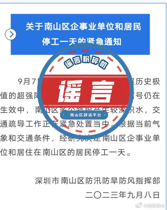 9月8日上午,「創(chuàng)新南山」官方微博發(fā)布一則闢謠稱:9月8日,網(wǎng)絡(luò)流傳一則「關(guān)於深圳南山區(qū)企事業(yè)單位和居民停工一天的緊急通知」。經(jīng)核實(shí),該消息屬於網(wǎng)絡(luò)謠言。大家心情可以理解,謠言不可亂傳!