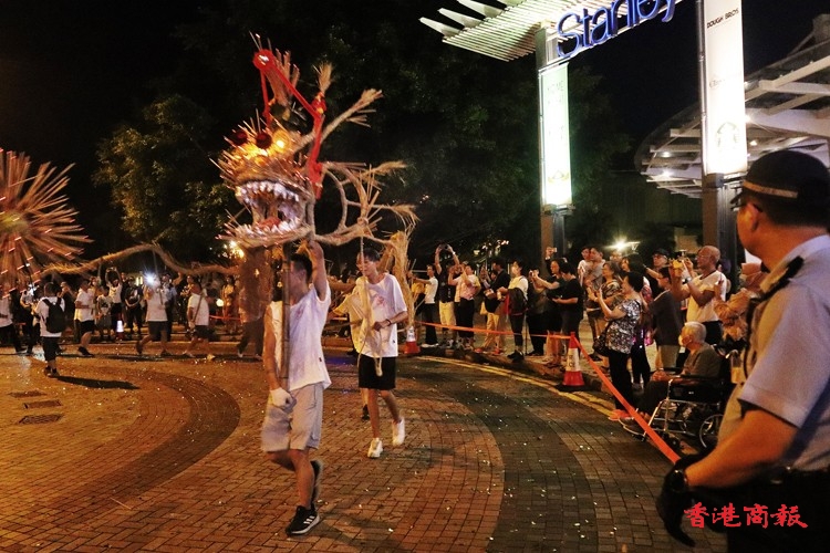 傍晚約6時(shí)半,健兒們舉著火龍巡遊赤柱,由廣場迴旋處出發(fā),先到天后古廟參拜,再經(jīng)赤柱大街到水僊古廟參拜,及後經(jīng)赤柱海濱長廊,返回赤柱大街,吸引不少市民、遊客圍觀。(馮瀚文攝)
