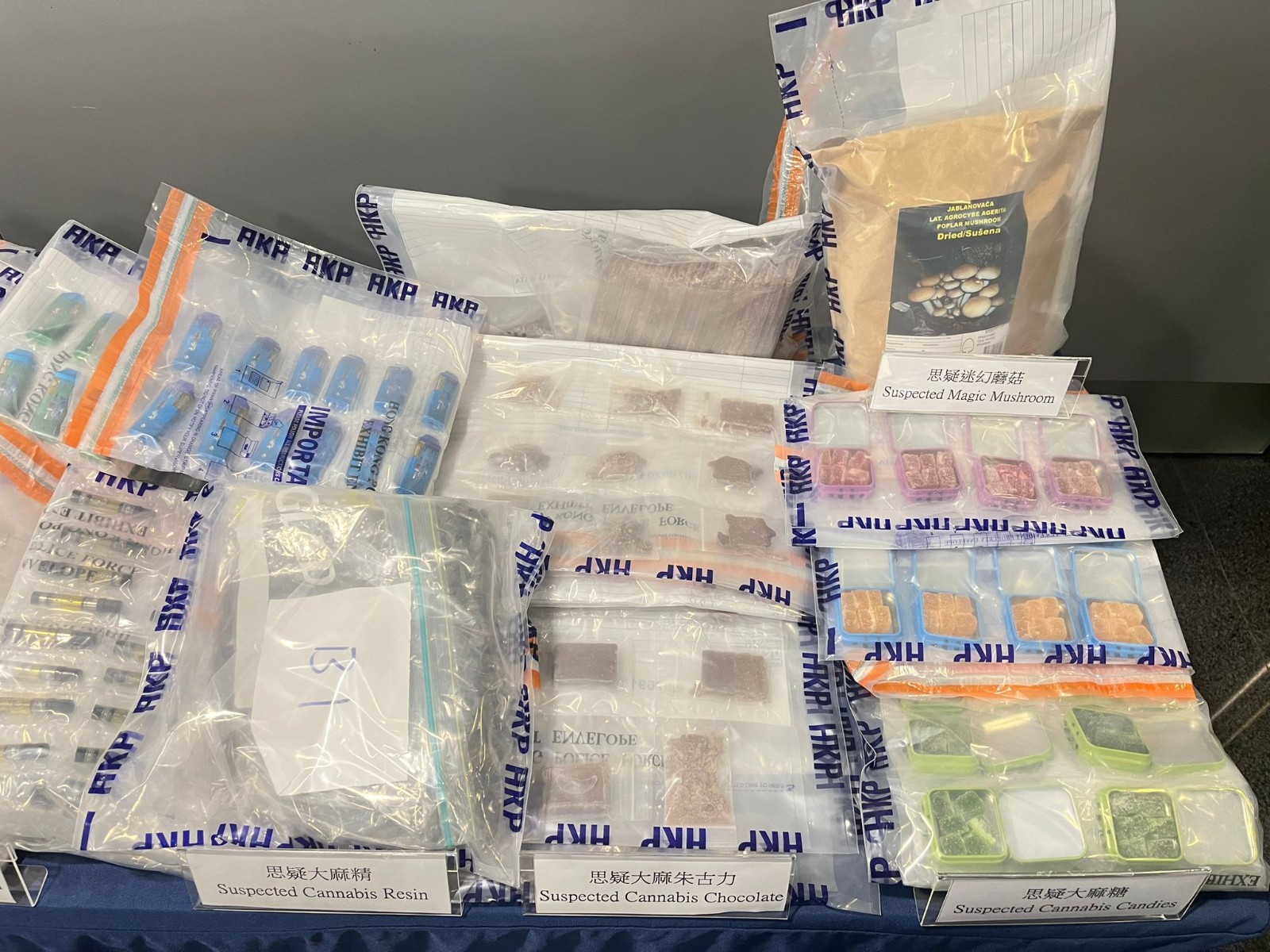 至前日(17日)晚上,警方人員分別在沙田、長沙灣、紅磡、及中環(huán)拘捕6男1女,搗破沙田一個(gè)毒品儲(chǔ)存?zhèn)}庫,檢獲約550克大麻花、一批大麻精油、一批懷疑CBD朱古力和毒郵票。至昨日(18日)再在佐敦、荃灣、沙田、觀塘、柴灣及粉嶺拘捕7男1女,搗破3個(gè)毒品儲(chǔ)存?zhèn)}庫,檢獲約100克大麻花、大批大麻朱古力、大麻精油、大麻煙油、大麻糖、867克大麻精和250克迷幻蘑菇。