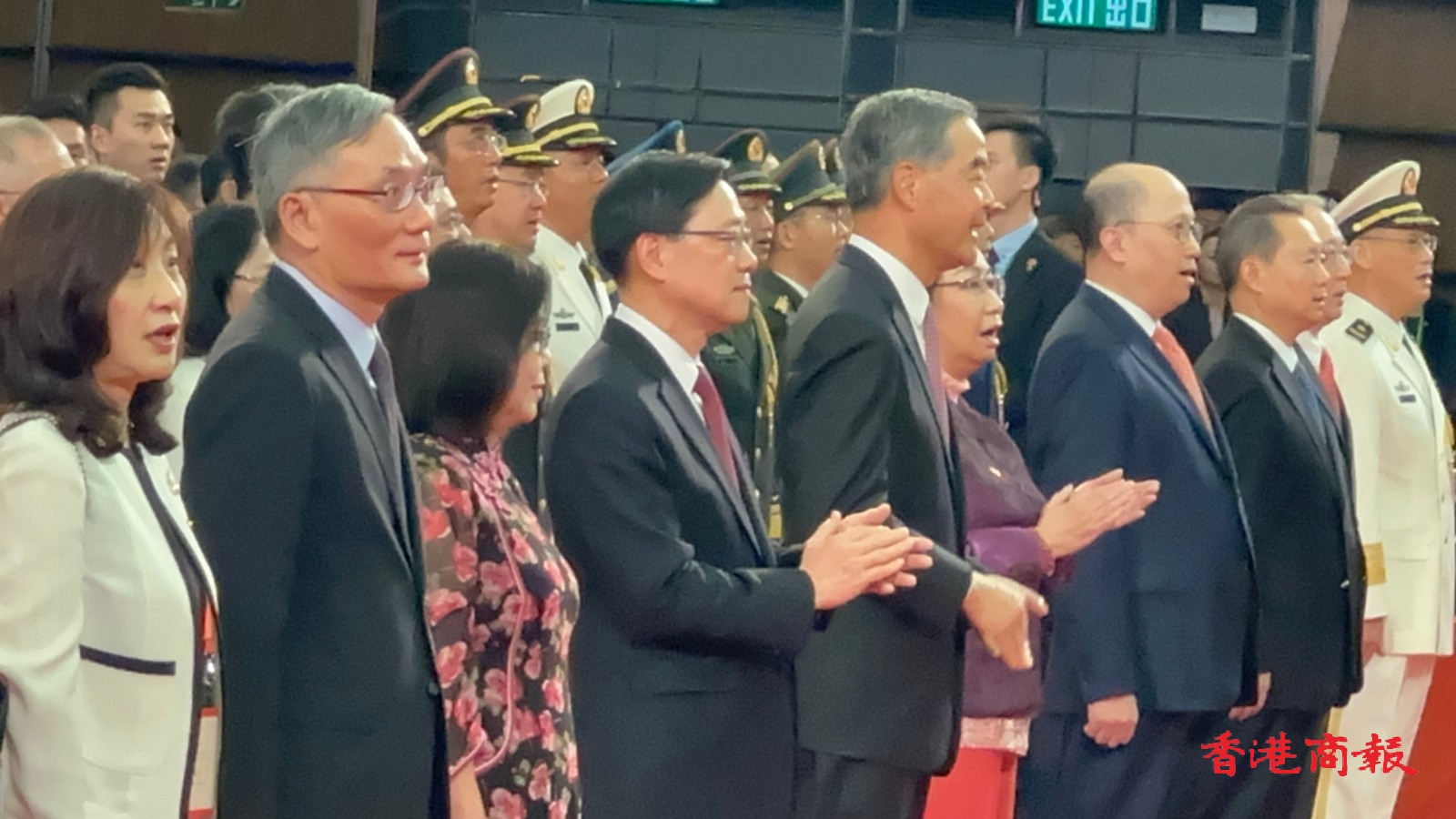 現(xiàn)場(chǎng)唱國(guó)歌,梁振英李家超全程拍手跟唱。記者 木子攝
