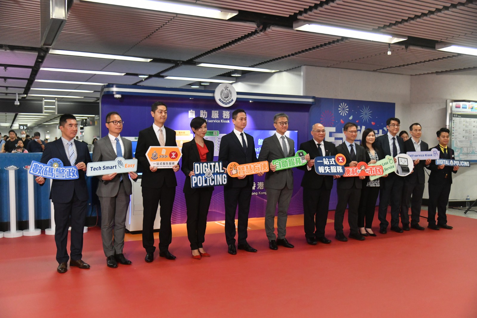 自助服務(wù)機(jī)啟動(dòng)儀式今日(5日)舉行,由警務(wù)處處長(zhǎng)蕭澤頤、香港鐵路有限公司(港鐵公司)車務(wù)及創(chuàng)新總監(jiān)李家潤(rùn)博士、行動(dòng)處處長(zhǎng)陳東、署理監(jiān)管處處長(zhǎng)關(guān)翠貞、港鐵公司營(yíng)運(yùn)主管(本地綫)呂幹貽及港鐵公司車站事務(wù)經(jīng)理(港島線、南港島線及將軍澳線)周賢良主禮。
