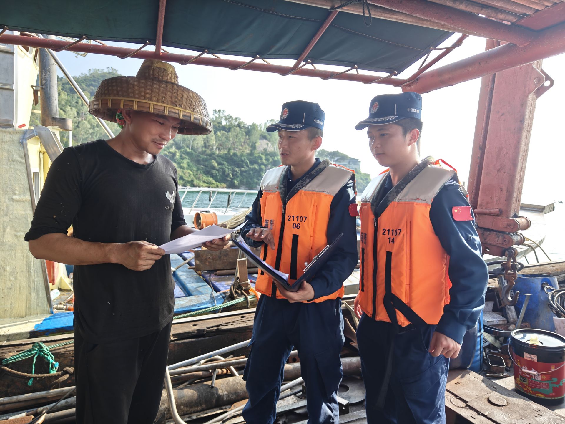 海警執(zhí)法員到漁船宣傳防颱風(fēng)要點(diǎn)。