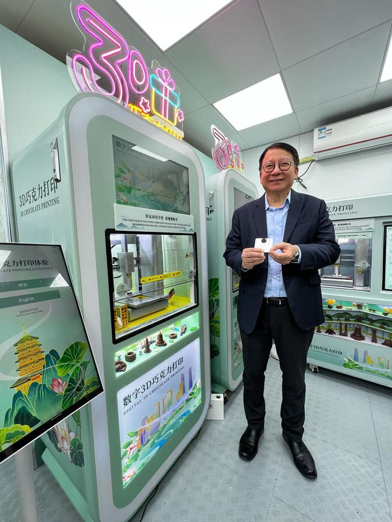 離開運(yùn)動(dòng)員村前,陳國(guó)基也體驗(yàn)了村內(nèi)一些先進(jìn)設(shè)施,包括在「3D打印·元宇宙體驗(yàn)艙」即場(chǎng)一試打印3D象棋朱古力,並跟「機(jī)械人乒乓」「對(duì)打」數(shù)板。他說(shuō),相信這些設(shè)施都是住在村內(nèi)各地運(yùn)動(dòng)健兒的「打卡點(diǎn)」,為他們的賽後日常生活增添一點(diǎn)樂趣。
