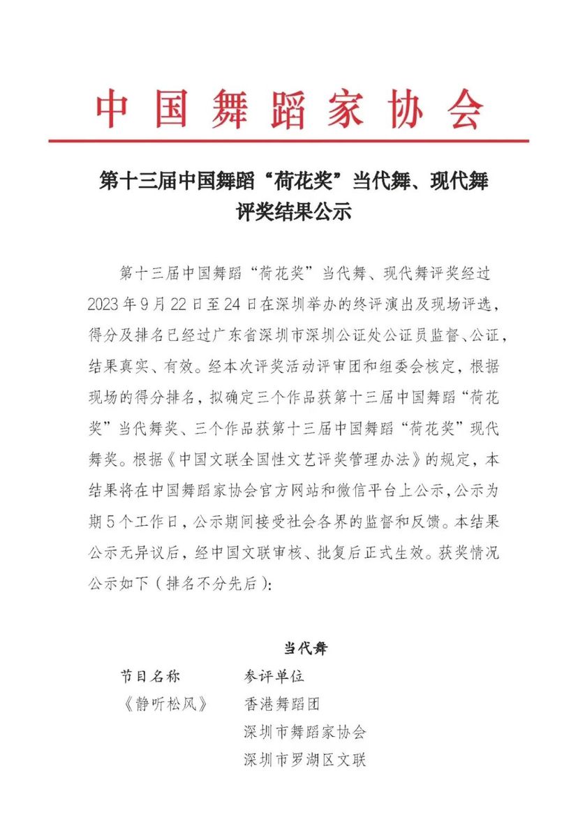 記者從中國舞蹈家協(xié)會獲悉,第十三屆中國舞蹈「荷花獎」當代舞、現(xiàn)代舞評獎9月22日至24日在深圳舉辦終評演出及現(xiàn)場評選,得分及排名經(jīng)公正後,經(jīng)評審團和組委會核定,根據(jù)現(xiàn)場的得分排名,擬確定三個作品獲第十三屆中國舞蹈「荷花獎」當代舞獎、三個作品獲第十三屆中國舞蹈「荷花獎」現(xiàn)代舞獎。其中,《靜聽松風》《停留片刻》兩部深圳作品分列當代舞、現(xiàn)代舞作品入選之列。