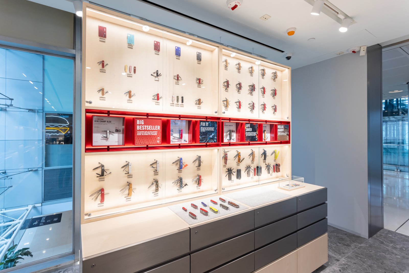 店內(nèi)每個部分都是探索的旅程,門店右方的旅行袋裝刀具互動展示裝置,充滿趣味地呈現(xiàn)品牌經(jīng)典的瑞士刀具系列。展?fàn)澱媸蔷x產(chǎn)品的鍛造故事,轉(zhuǎn)動面板時刀款的功能即時映入眼簾,探索經(jīng)典產(chǎn)品的歷史。門店另一端是「Test & Ride」旅行箱體驗區(qū),消費者能親身測試各款旅行箱包的材質(zhì)與功能,並直接從裝置中拉出體驗滑輪順滑度、測量收納容量等。