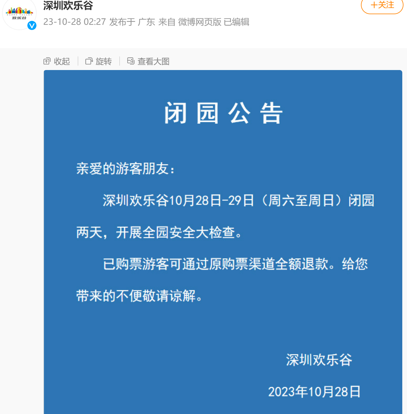 10月28日凌晨,深圳歡樂谷官微發(fā)布閉園公告,公告稱將於10月28日﹣29日(周六至周日)閉園兩天,開展全園安全大檢查。已購票遊客可通過原購票渠道全額退款。
