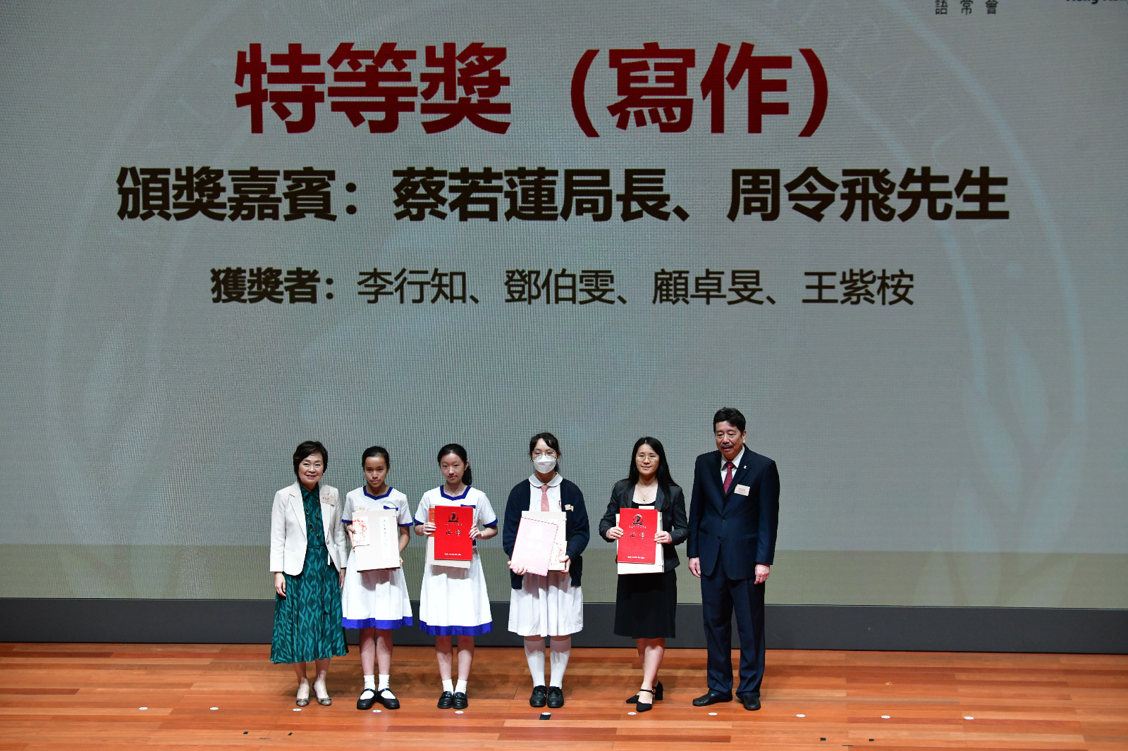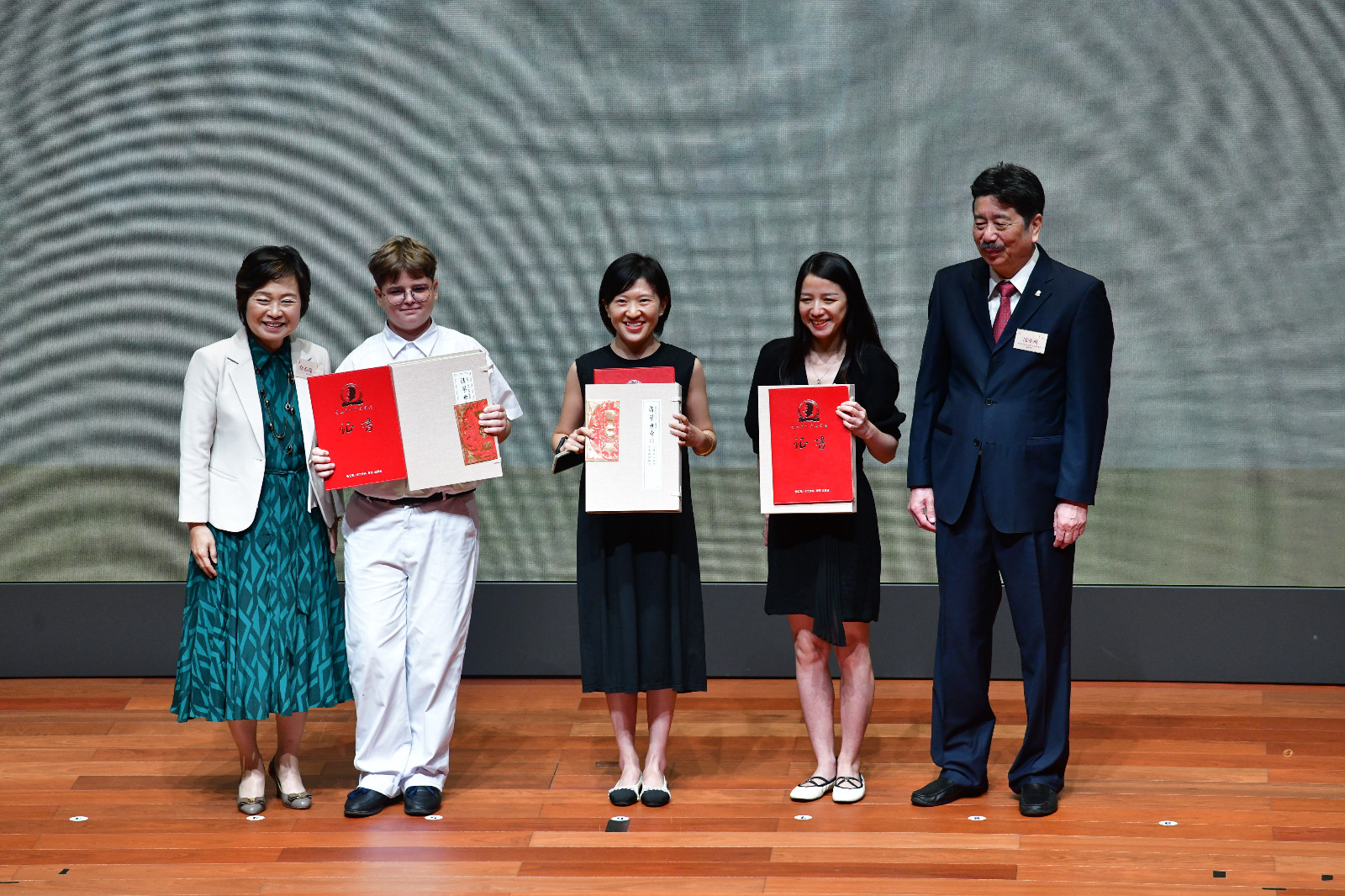 教育局局長蔡若蓮與魯迅文化基金會(huì)會(huì)長兼秘書長周令飛向非母語組書法(特等獎(jiǎng))的學(xué)生頒獎(jiǎng)。