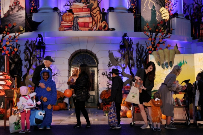 樂隊拉著黑色小提琴,白宮門廊掛滿黑色蜘蛛網(wǎng),還有長滿地的南瓜和鮮花,抬頭更可看到女巫乘著飛天掃把的身影,白宮當天晚上,成了魔幻不夜宮。(圖源:路透社)