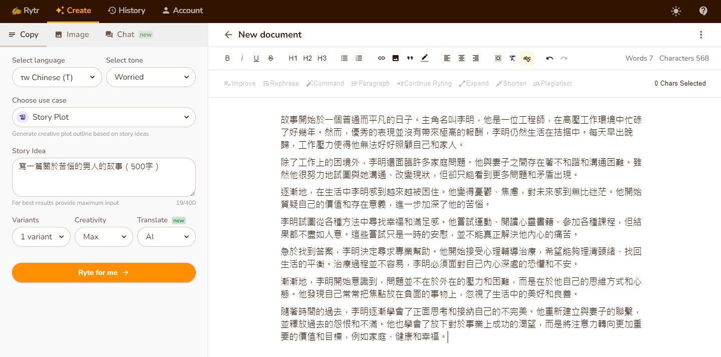 首先,記者在Rytr輸入「苦惱的男人」,軟件生成一篇500字的短文。AI故事講述一位工程師工作表現(xiàn)優(yōu)秀,卻不獲賞識,回家後還要面對婚姻問題。堆積的壓力使他變得憂鬱,最後他尋求心理輔導(dǎo),學(xué)會改變心態(tài),獲得快樂。Rytr筆下主角,除了性別、職業(yè)外,並沒有其他關(guān)於個性的描述,讀者無法了解主角的性格、行為動機。而且,AI生成的文筆直白粗略,欠缺修辭技巧,常以兩字形容詞描述角色的感受,如文章的情感核心「苦惱」,就是以「苦惱」二字帶過,難讓讀者切身體會主角的苦惱何在。綜合而言,此文文筆乏味、內(nèi)容沉悶,散發(fā)一股「AI味」。單是短短500字,已經(jīng)完美「演繹」了上述學(xué)生對AI的負(fù)面評價。