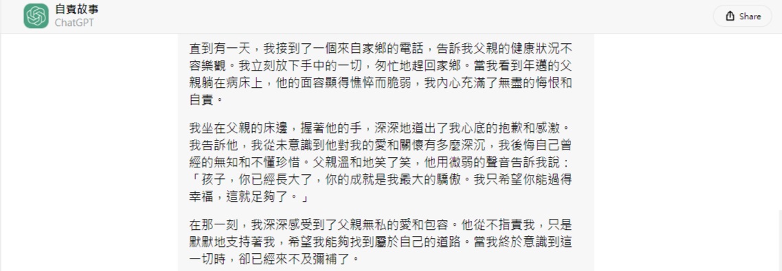 記者再嘗試輸入更具體的指令:「以第一人稱寫一篇關(guān)於主角離鄉(xiāng)求學(xué),與年邁父親道別的故事,抒發(fā)主角對年少不懂珍惜父愛的自責(zé)。」有了故事框架的引導(dǎo),AI生成的劇情不像之前般陳腔濫調(diào)。第一人稱的敘事彷彿能讓AI代入故事,加入對人物的細(xì)緻描寫,文筆也較為生動。例如在故事高潮,父親病危,主角回鄉(xiāng)探望的片段:「進門時看到他脆弱的身影坐在椅子上,眼神中透露出無盡的愛。我趴在他身旁,痛悔地告訴他我多年來的忽視和自責(zé)。父親輕輕地摸著我的頭,說道:『重要的不是過去的遺憾,而是我們現(xiàn)在能夠共度時光的每一刻?!弧?/p>