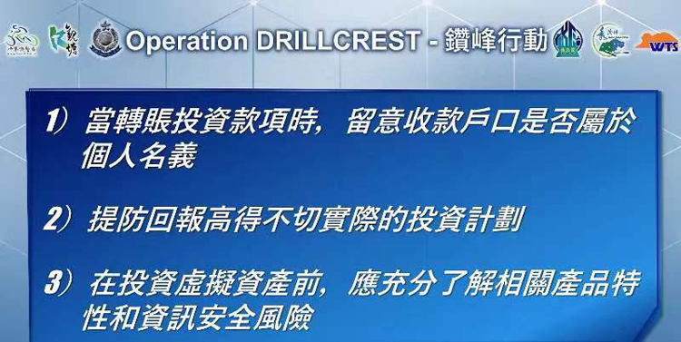 觀塘警區(qū)科技及財(cái)富罪案組梁普恩督察提醒市民,當(dāng)收到不明來(lái)歷訊息,網(wǎng)上帖文或廣告以高回報(bào)、低風(fēng)險(xiǎn)和市場(chǎng)內(nèi)幕消息作招徠吸引投資,應(yīng)在轉(zhuǎn)賬投資款項(xiàng)時(shí),留意收款戶口是否屬個(gè)人名義,切勿轉(zhuǎn)賬到與投資公司無(wú)關(guān)的戶口。並要提防回報(bào)高得不切實(shí)際的投資計(jì)劃。投資虛擬資產(chǎn)前應(yīng)該充分了解相關(guān)產(chǎn)品特性,資訊安全風(fēng)險(xiǎn),以免被不法分子利用。(記者 區(qū)天海)