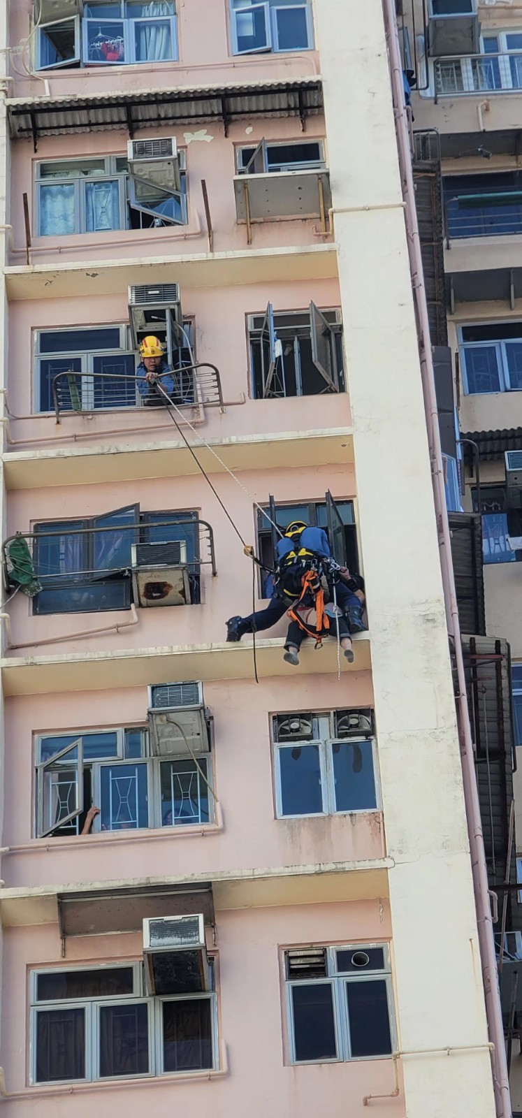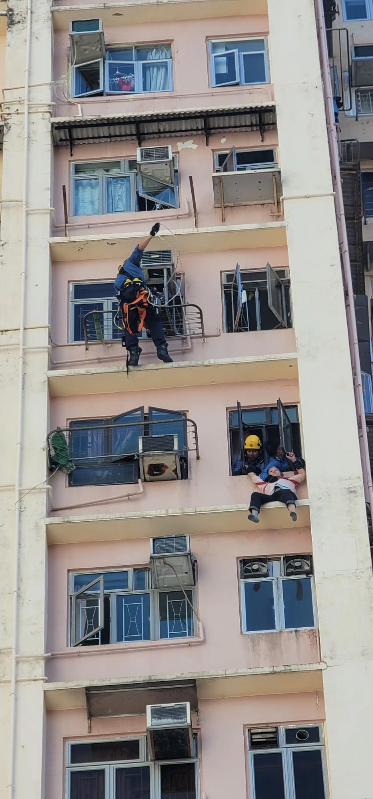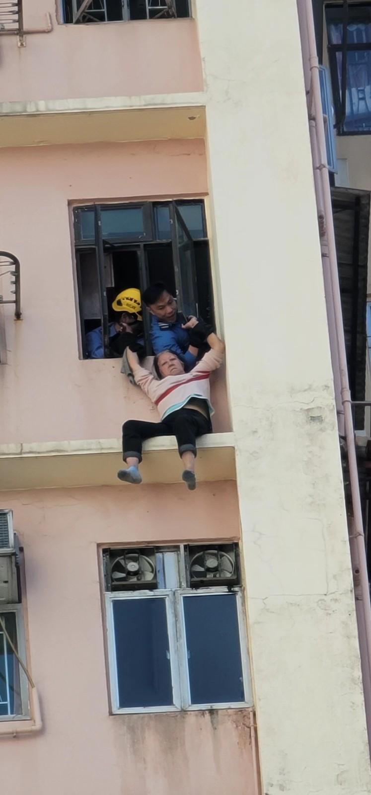 警員到場封鎖一段定業(yè)街與定安街交界,消防員先在地下張開救生氣墊戒備,登樓進(jìn)入單位,當(dāng)時老婦胞弟在家,兩名消防員在窗旁捉緊老婦雙手,因擔(dān)心她失平衡跌下,另一隊(duì)「飛將軍」到上層單位,游繩而下,用救生索將老婦綁緊,再合力將她拉回屋內(nèi),經(jīng)救護(hù)員檢驗(yàn)初步證實(shí)沒有受傷,送院作進(jìn)一步治理。