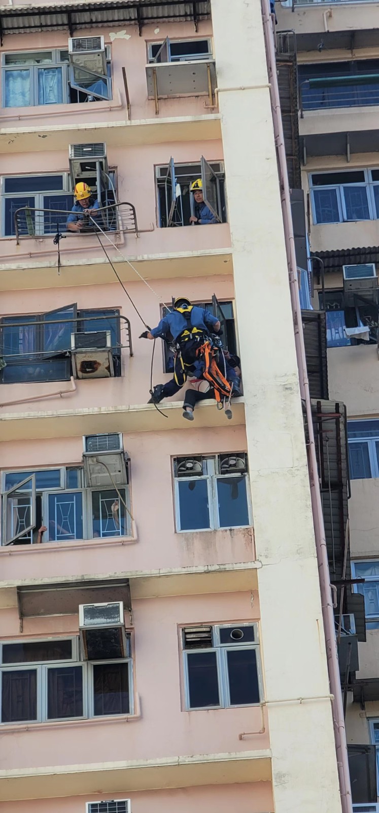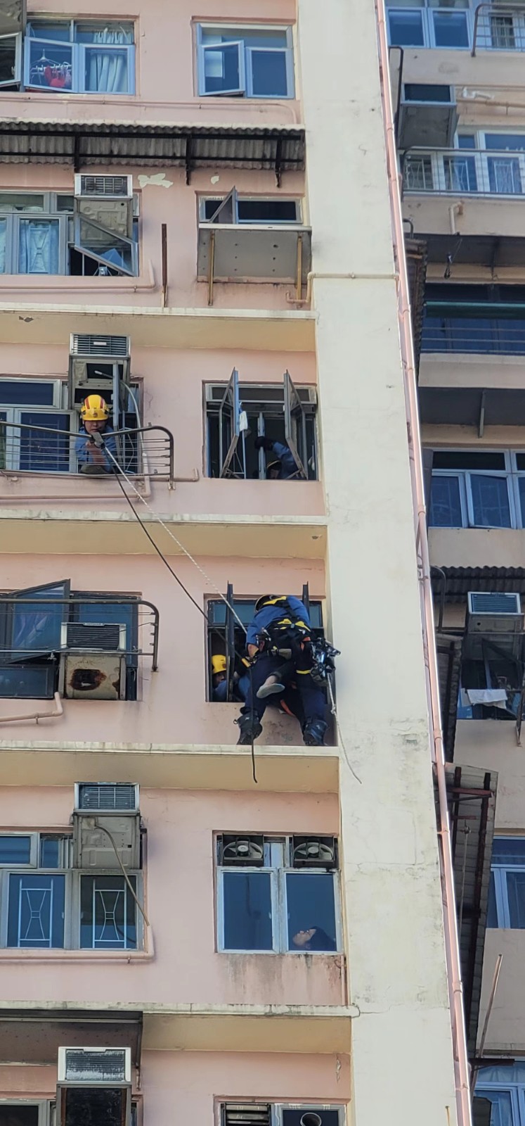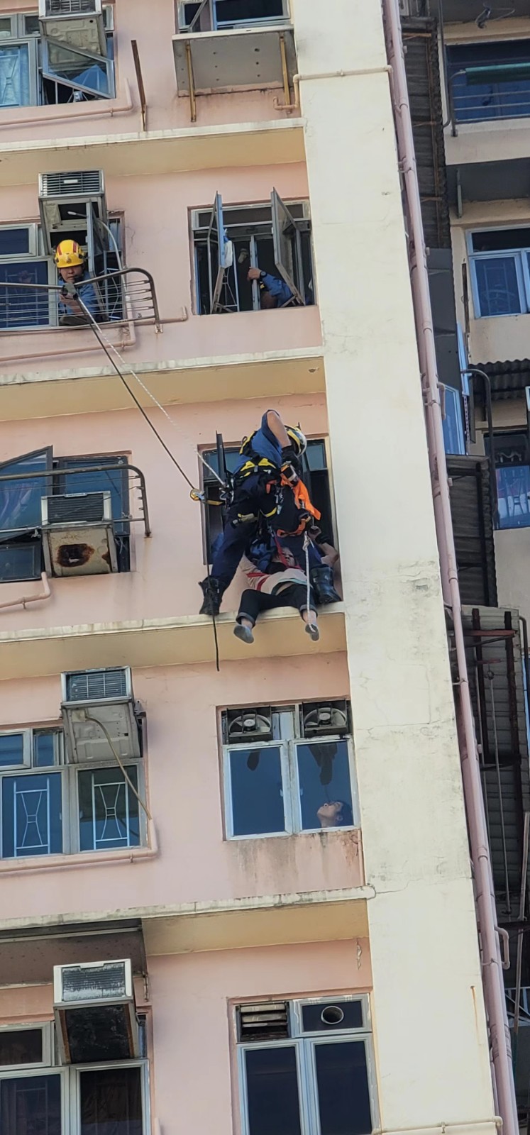 警員到場封鎖一段定業(yè)街與定安街交界,消防員先在地下張開救生氣墊戒備,登樓進(jìn)入單位,當(dāng)時老婦胞弟在家,兩名消防員在窗旁捉緊老婦雙手,因擔(dān)心她失平衡跌下,另一隊(duì)「飛將軍」到上層單位,游繩而下,用救生索將老婦綁緊,再合力將她拉回屋內(nèi),經(jīng)救護(hù)員檢驗(yàn)初步證實(shí)沒有受傷,送院作進(jìn)一步治理。