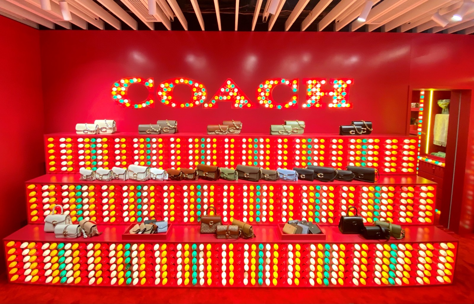 限定店設(shè)計採用千枚紅、綠、黃、白四色LED燈泡打造,以霓虹光影點亮節(jié)日溫暖氣氛。全店以聖誕紅為主色調(diào),配合四色LED燈展示臺及展架,一眼望見最新系列、經(jīng)典Tabby展臺及精品配飾展櫃,陳列方式簡潔利落。