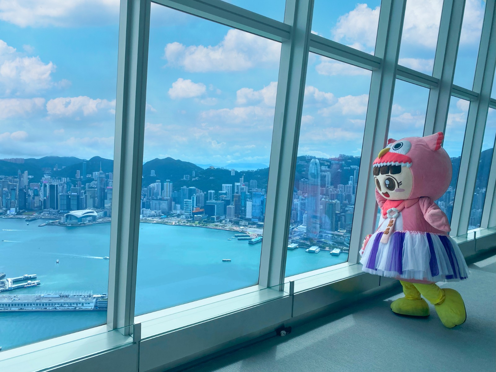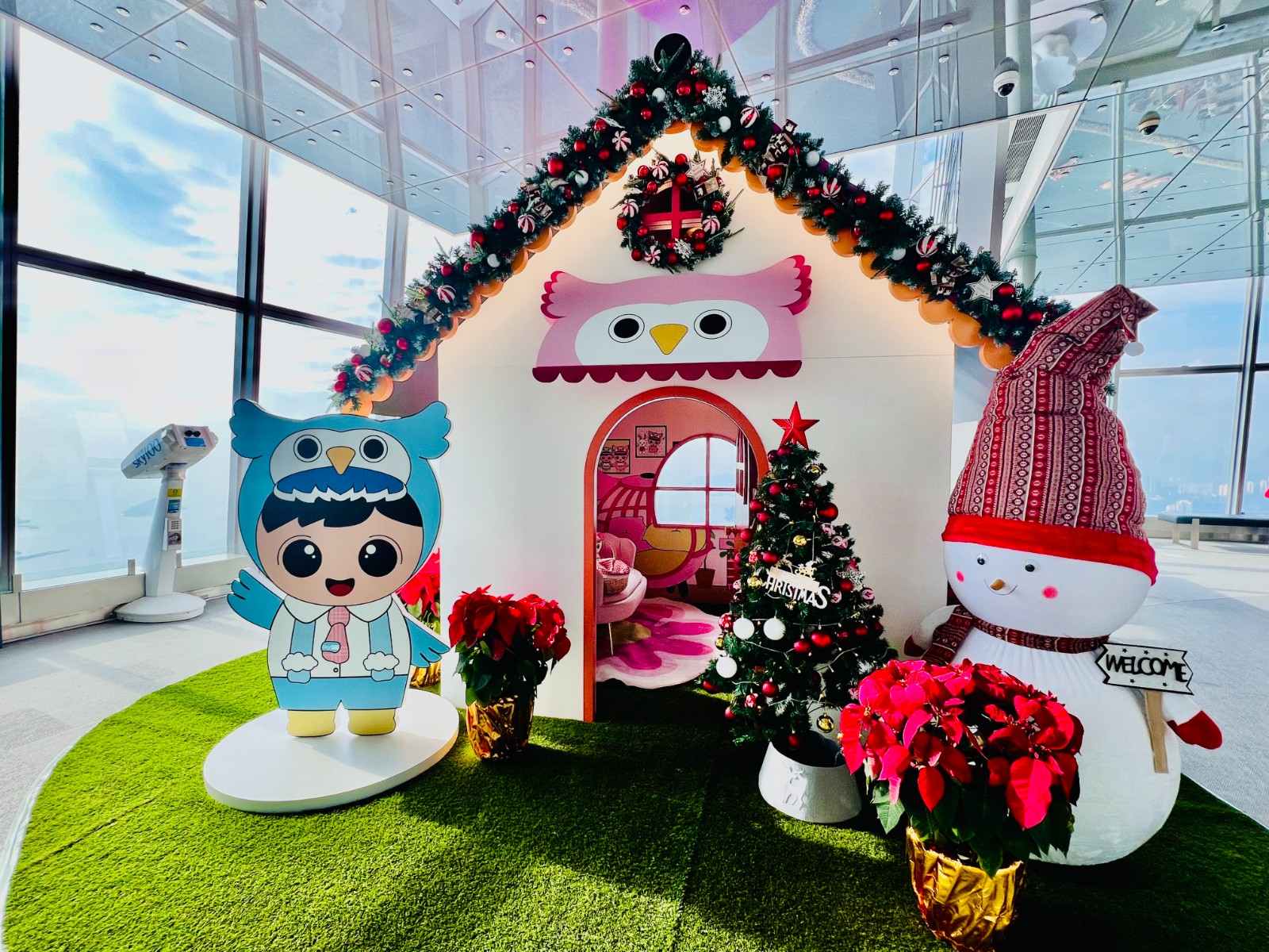 貓頭鷹招福精靈易易MoMo與家庭成員諾諾Noah登陸夢(mèng)幻聖誕樹屋,訪客可走進(jìn)樹屋內(nèi)觀賞海拔393米高的高空風(fēng)景?;顒?dòng)期間觀景臺(tái)展出約1.8米高的大型易易MoMo供訪客拍照,讓招福精靈為大家?guī)砀?。易易MoMo更會(huì)舉辦「聖誕共聚時(shí)刻」,以全新造型亮相並聯(lián)同小朋友合唱團(tuán)一起唱聖誕歌,其打扮配合觀景臺(tái)特色,頭戴環(huán)球貿(mào)易廣場(chǎng)造型帽子,身穿天藍(lán)色裙子且以雲(yún)朵花邊點(diǎn)綴,並設(shè)拍照環(huán)節(jié)。