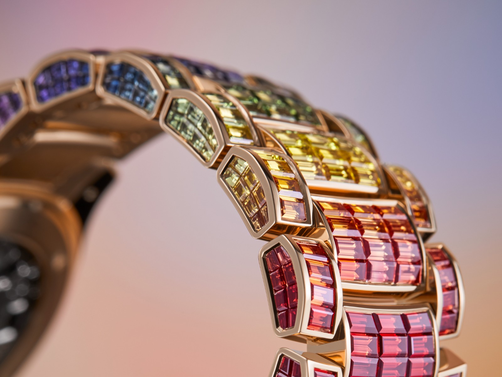 表鏈以玫瑰金製,鋪鑲長方形多色藍寶石。