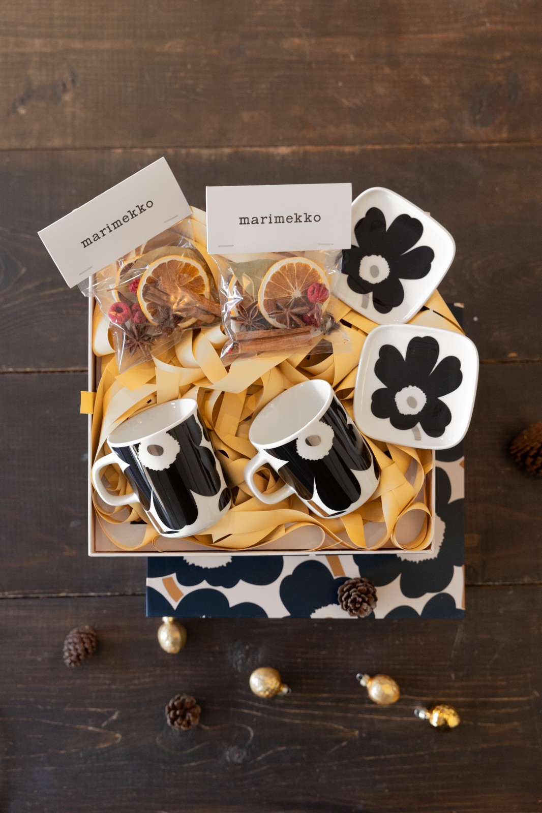品牌並推出節(jié)日限定禮盒套裝,外包裝是深藍搭配燙金的UNIKKO印花,內(nèi)有一對UNIKKO或KUUSIKOSSA印花的馬克杯和碟子套裝,限量附送芬蘭傳統(tǒng)聖誕熱飲Mulled wine spice兩份。