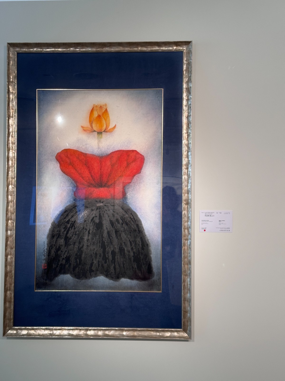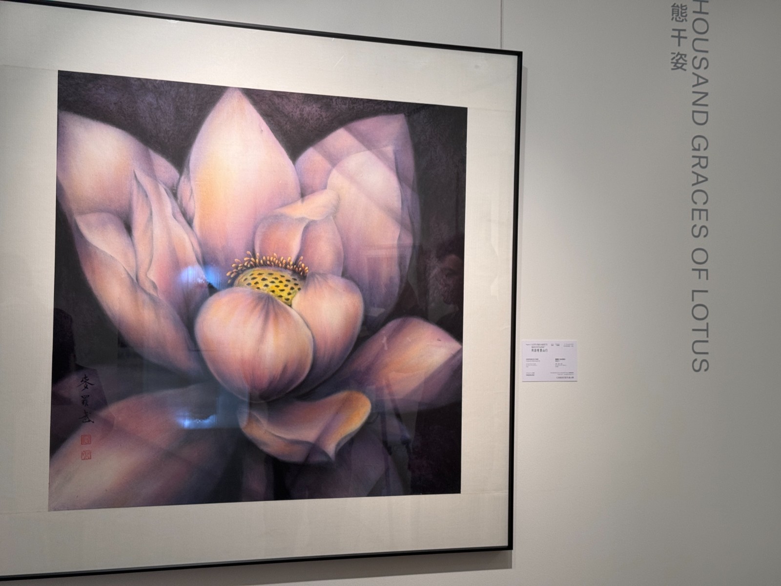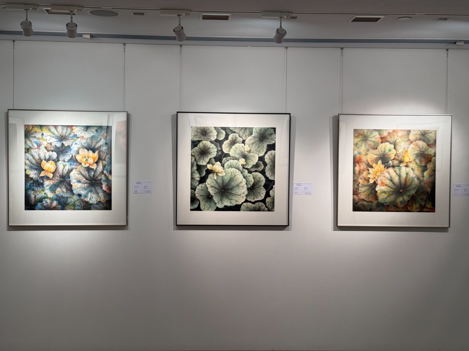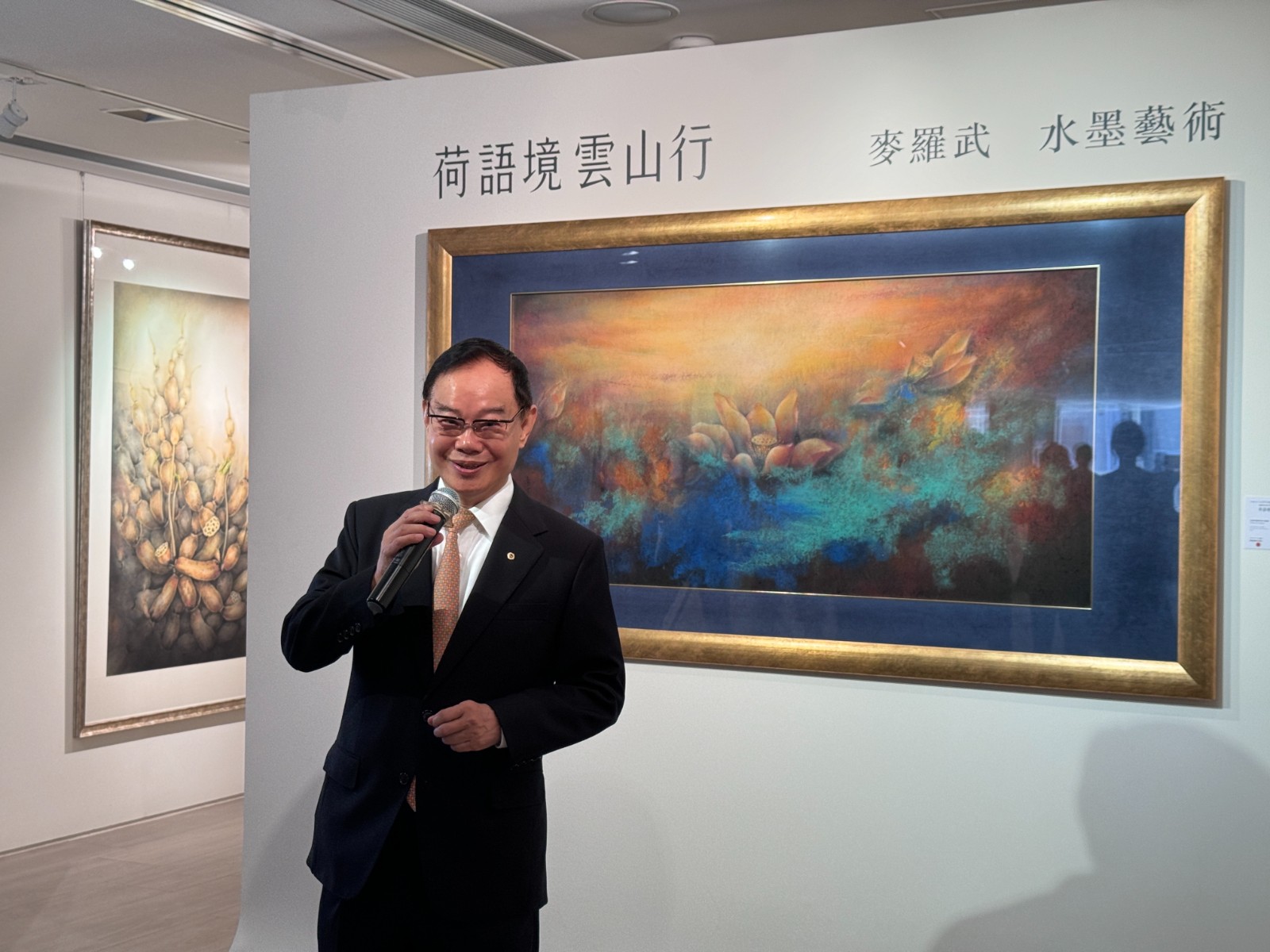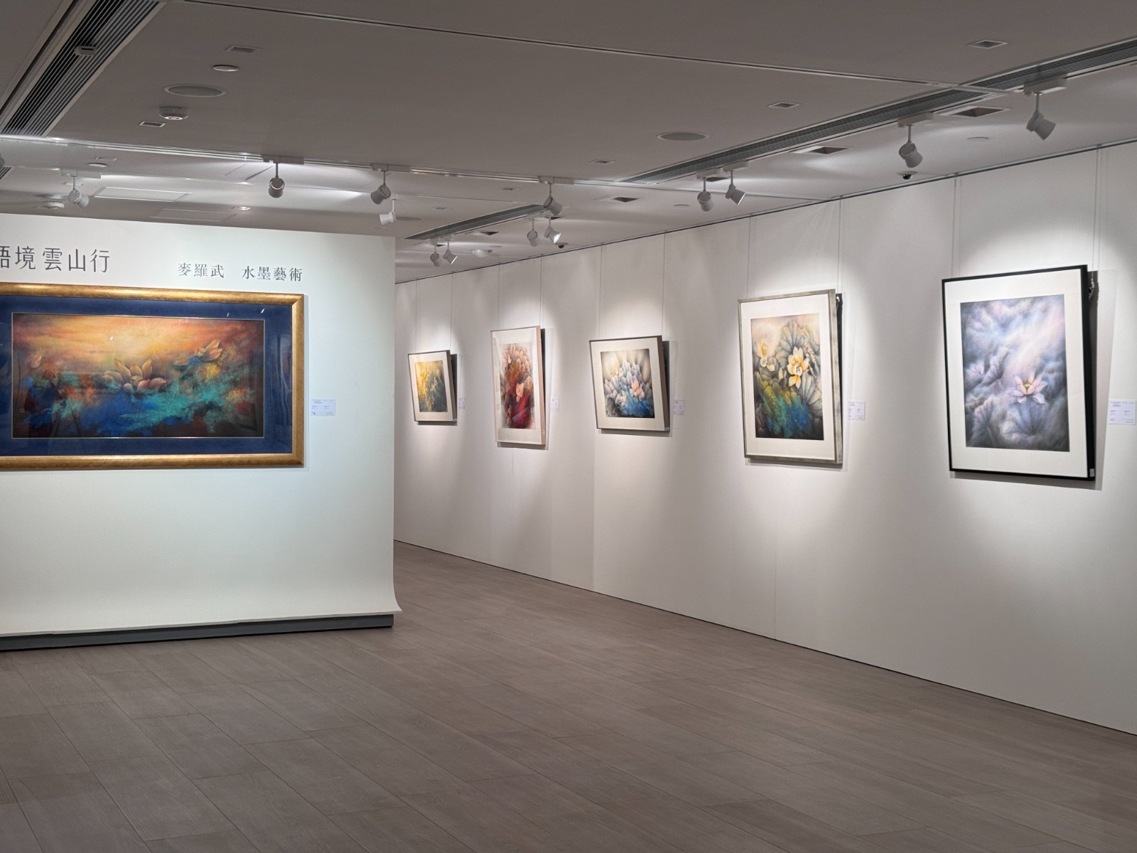 展覽展出以荷花為主題的系列水墨畫。荷花在中國文化中具有獨(dú)特的象徵意義,所謂「蓮,花之君子也?!故乔逡莞哐诺拇恚怨乓詠韲嫾覐奈赐V惯^對荷花的描繪。麥羅武的荷花將傳統(tǒng)與現(xiàn)代融合,形成獨(dú)樹一格的藝術(shù)語言。他善用深淺層次的筆觸,表現(xiàn)荷花的層次感和生命力。他巧妙運(yùn)用水墨,觀畫者可欣賞到麥羅武以水墨呈現(xiàn)荷花的不同姿態(tài),有的輕盈如夢,有的豔麗奪目。畫作不僅在技巧和色彩上獨(dú)具匠心,還透露出藝術(shù)家對生命、情感和自然的深刻領(lǐng)悟。新作《艷陽》,以重彩描畫荷塘水影,襯托出盛開彩荷在艷陽照射下的璀璨。作品中虛實(shí)交錯(cuò),光影變化,營造出奇幻夢境,使觀者彷彿漫步在自然之間。