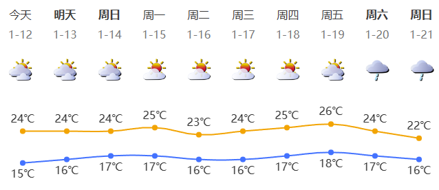 1月12日,深圳多雲(yún),早晚有輕霧;氣溫15-24℃;東風(fēng)2-3級;相對濕度45%-75%。