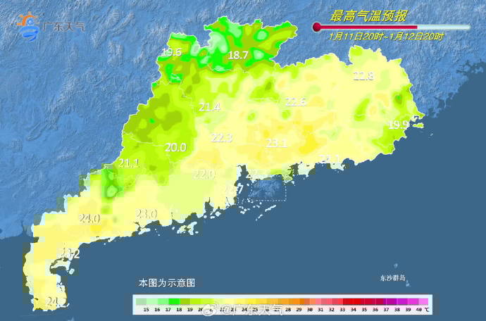 廣東省1月11日20時(shí)-1月12日20時(shí)最高氣溫預(yù)報(bào)。圖源:@廣東天氣