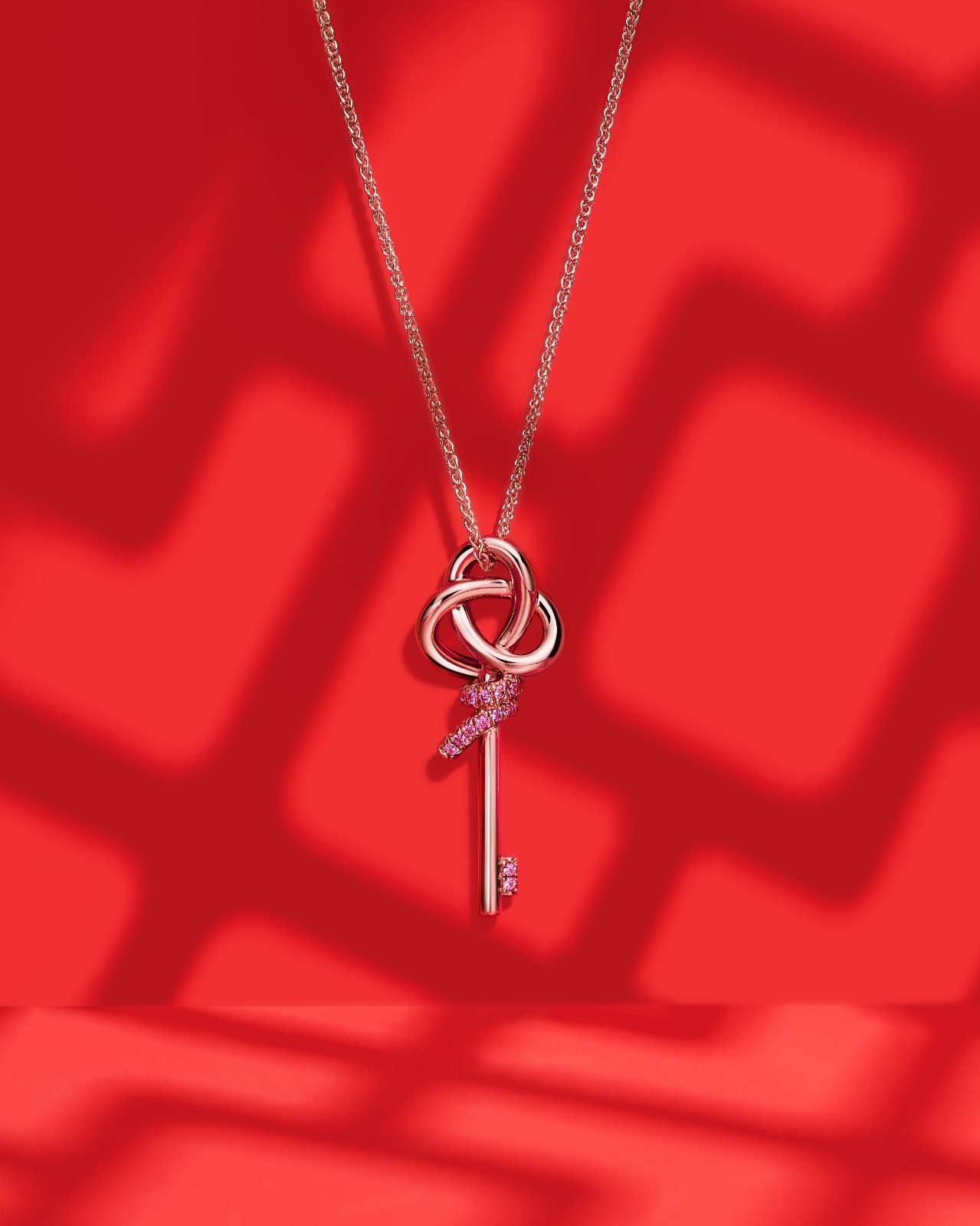 全新系列的設(shè)計靈感來自 1880 年代末的 Tiffany 典藏古典鑰匙設(shè)計,寓意愛情的無限可能。系列產(chǎn)品包括戒指、耳環(huán)、手鏈,還有吊墜,皆鑲嵌了品牌的精美鑽石,並以 18K 玫瑰金打造獨特的紐結(jié)設(shè)計。香港等指定地區(qū)並推出了獨家的18K 玫瑰金鑲粉紅色藍寶石迷你吊墜,為春節(jié)增添濃厚的喜慶氣氛。