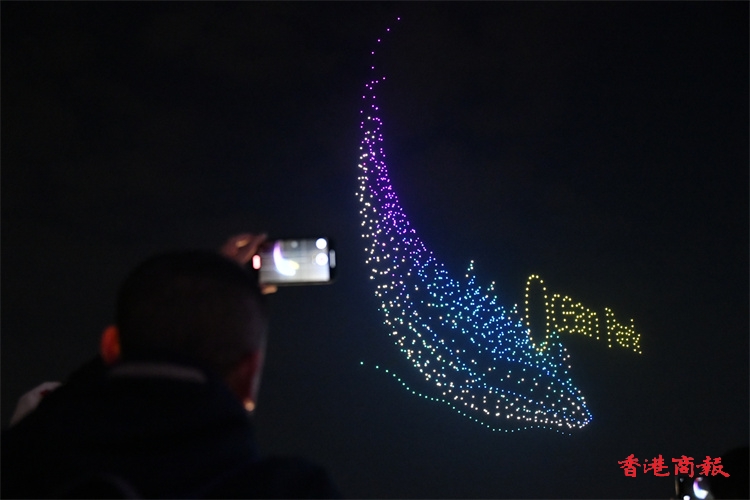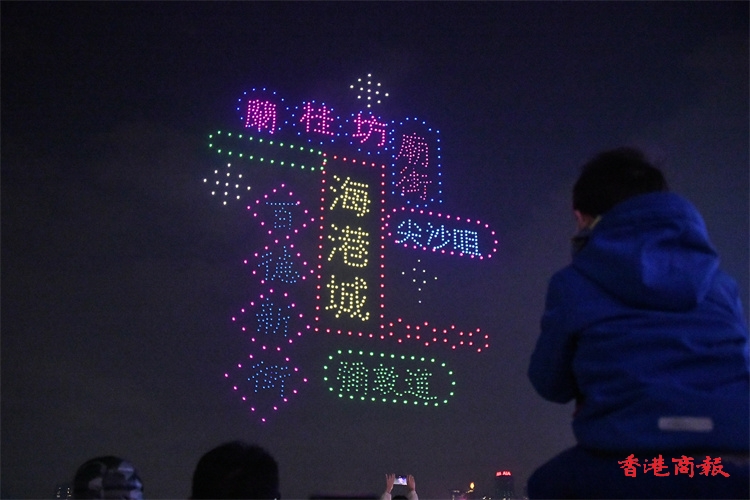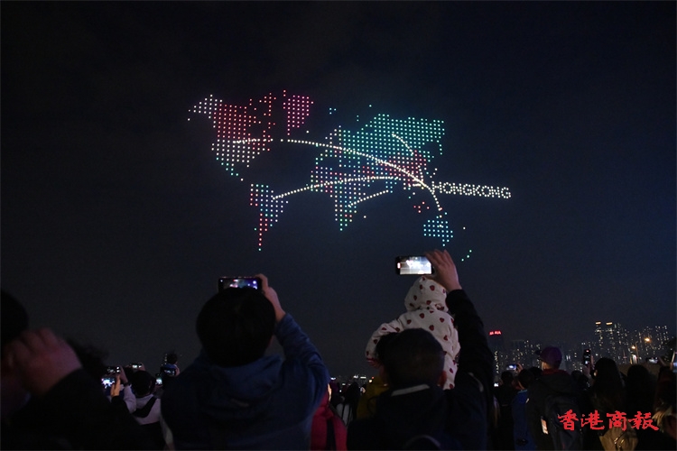 為支持響應(yīng)特區(qū)政府「日夜都繽紛」主題活動(dòng),由紫荊文化集團(tuán)主辦的「繽紛香港」大型無人機(jī)燈光秀表演活動(dòng)今晚(28日)在灣仔舉行,逾千架無人機(jī)以創(chuàng)意秀形式展現(xiàn)香港特色的畫面元素,讓觀眾感受東方之珠的浪漫風(fēng)采。首先,無人機(jī)秀出一幅世界地圖及「HONG KONG」文字,接著演變?yōu)榇篝~、機(jī)器人智慧魔方、粵劇花旦臉譜、巨龍、蘭桂坊與廟街等文字、山頂及纜車圖案等。最後,無人機(jī)秀出領(lǐng)取眾多商家提供的遊覽、住宿、購物、出行優(yōu)惠券的巨型二維碼,在場觀眾均讚嘆不已。(蔡啟文攝)