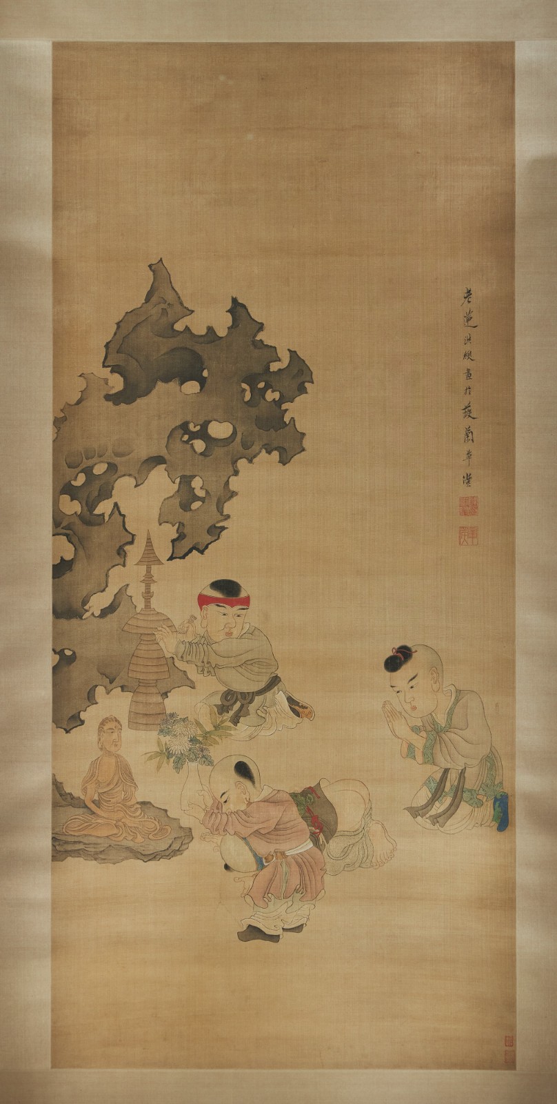 陳洪綬作品《童子禮佛圖(一作「戲嬰圖」)》。