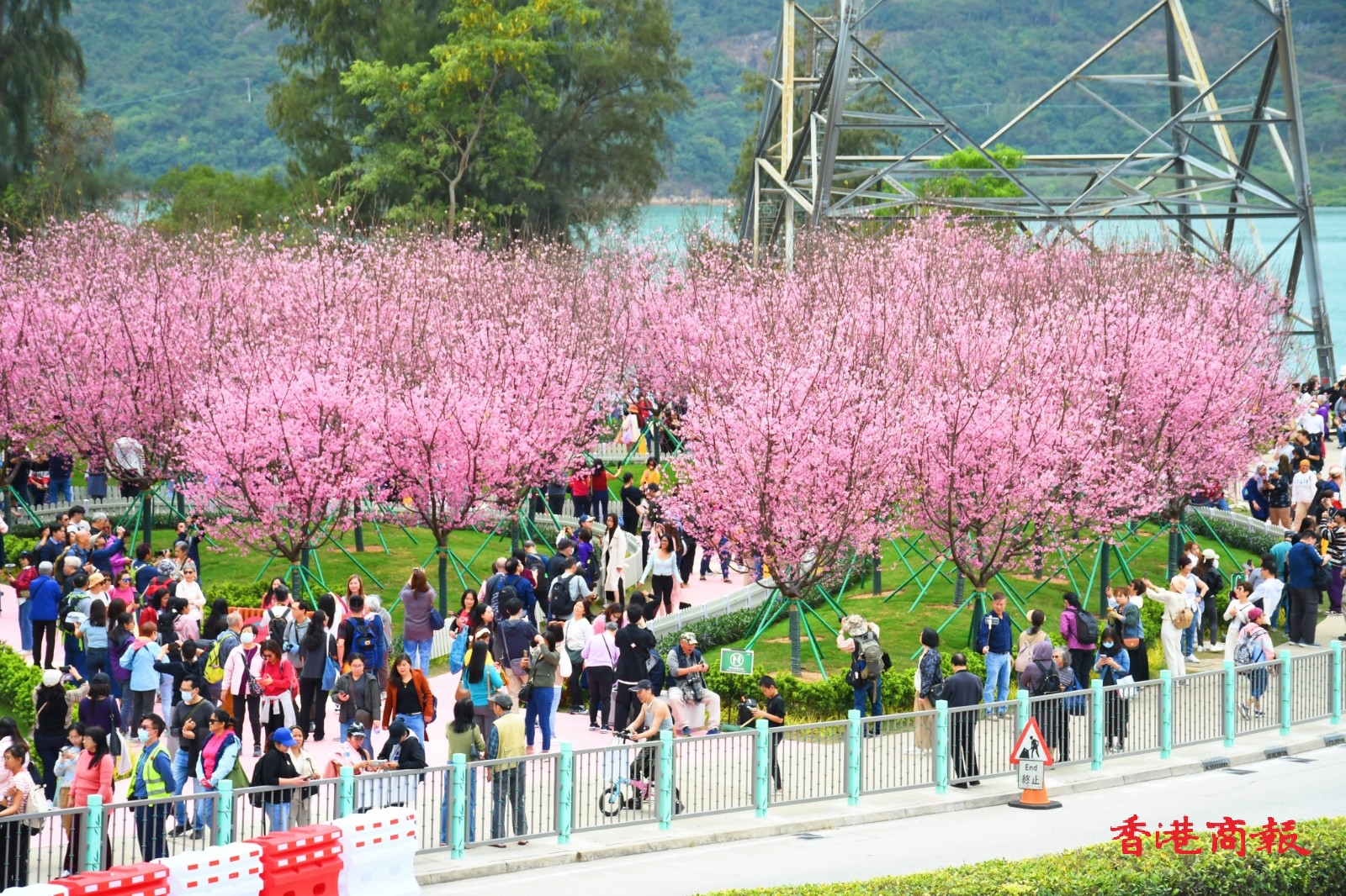 「東涌櫻花園」自從去年開幕後,成為香港人氣賞櫻新熱點。今年機管局種植85棵「好運來」櫻花樹,比往年的「廣州櫻」更耐熱、更紅艷,更適合香港天氣。正值花期,這片草地慢慢被櫻花染成浪漫的粉紅色,市民可以在行人步道上近距離打卡賞花。若乘搭昂坪纜車,更可以俯瞰角度欣賞整片粉色花海。
