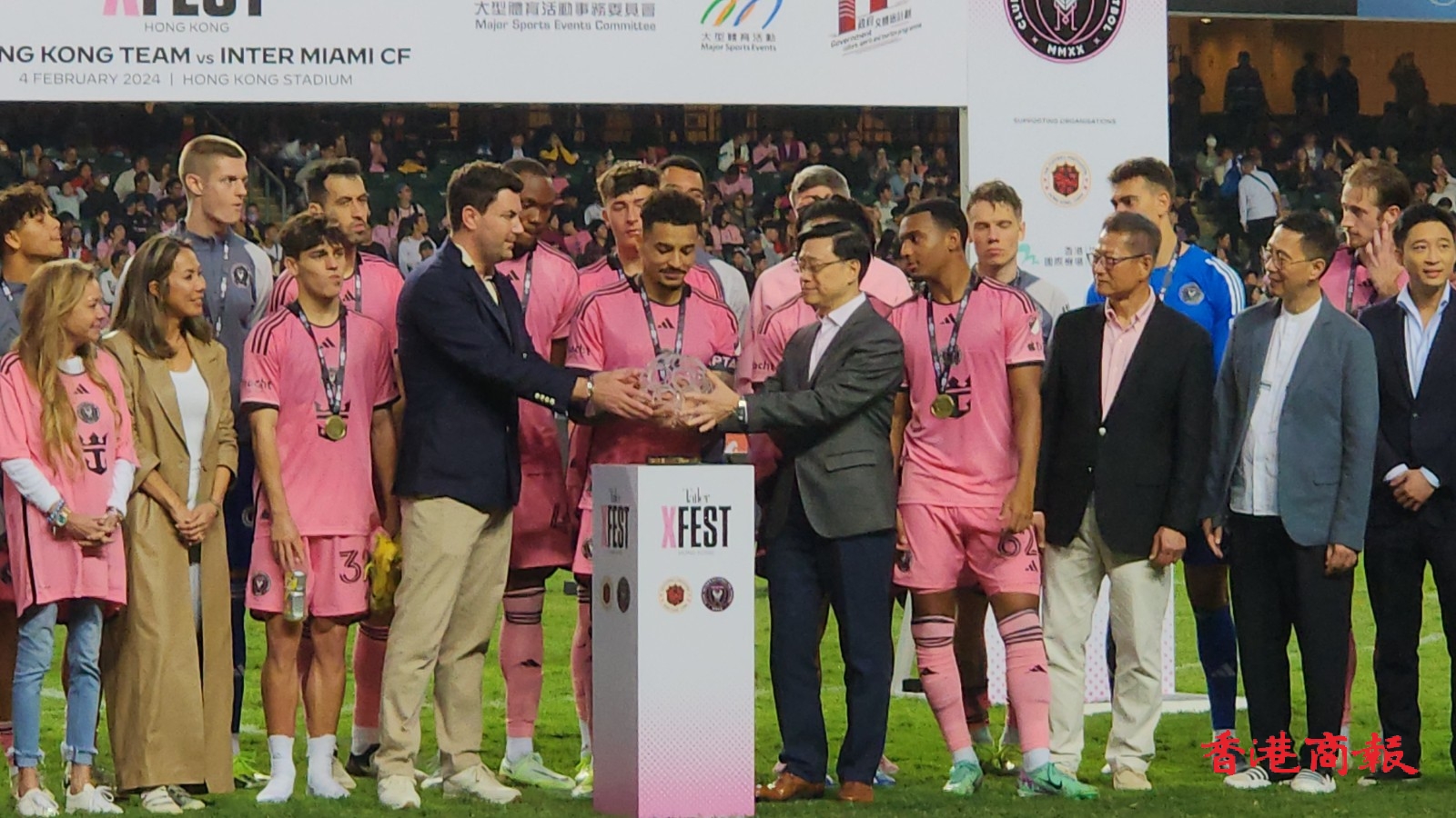 比賽結(jié)束之後,特首李家超等政府官員與獲勝隊(duì)伍邁阿密國際隊(duì)員合照。