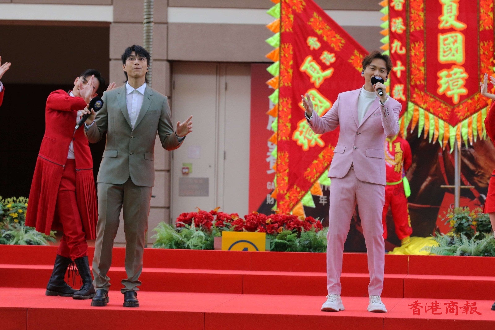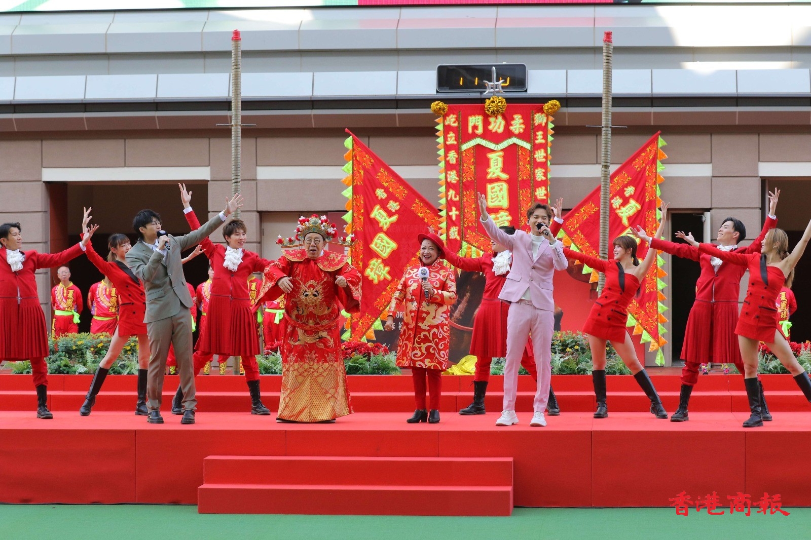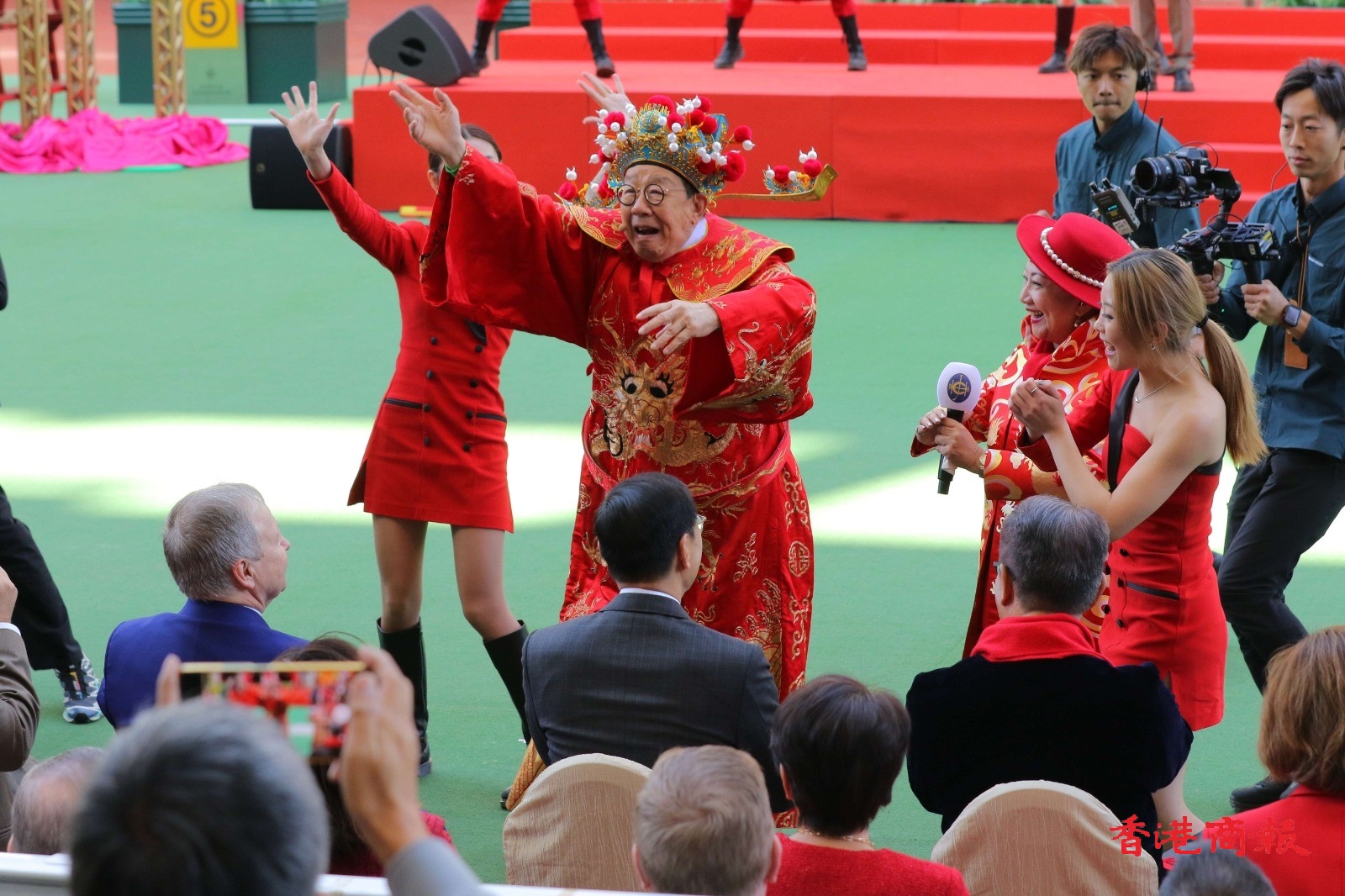 之後輪到坤哥及吉吉上臺獻(xiàn)唱,兩人先後合唱 《歡樂年年》及《財神到》,而修哥就是化身財神亮相,先向財政司司長陳茂波、馬會主席利子厚、馬會董事、馬會行政總裁應(yīng)家柏及現(xiàn)場馬迷拜年。