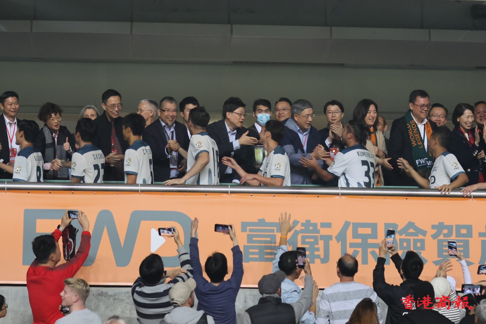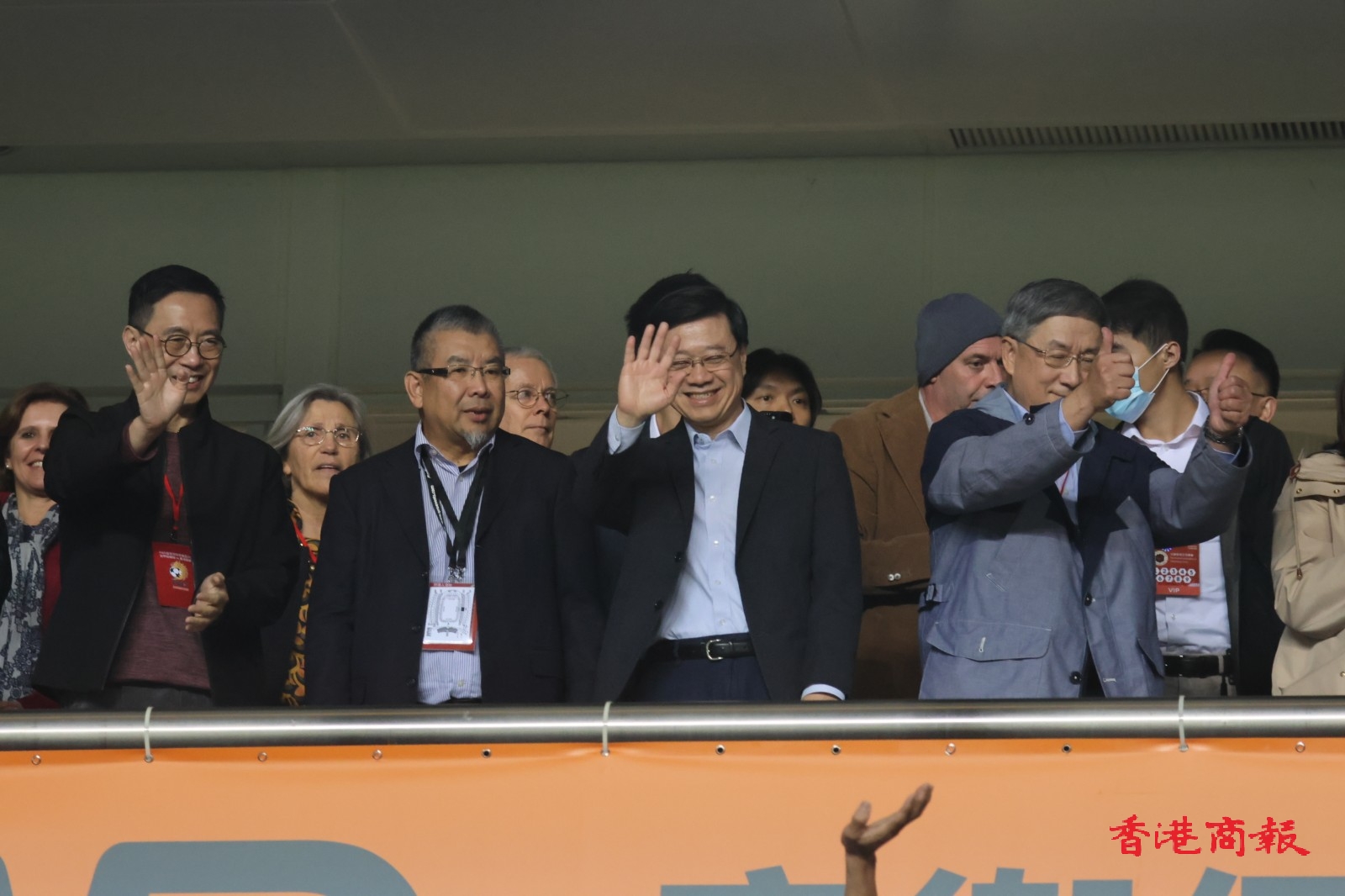 在賽後頒獎禮上,李家超笑容滿面,不時與球迷揮手示好,又同香港明星隊的山度士熱情握手,其後輪到世界明星隊球員逐一上臺,特首更與英格蘭門將大衛(wèi)占士來個擁抱,心情相當興奮,可說是盡慶而歸。(文、圖、影片:志誠)