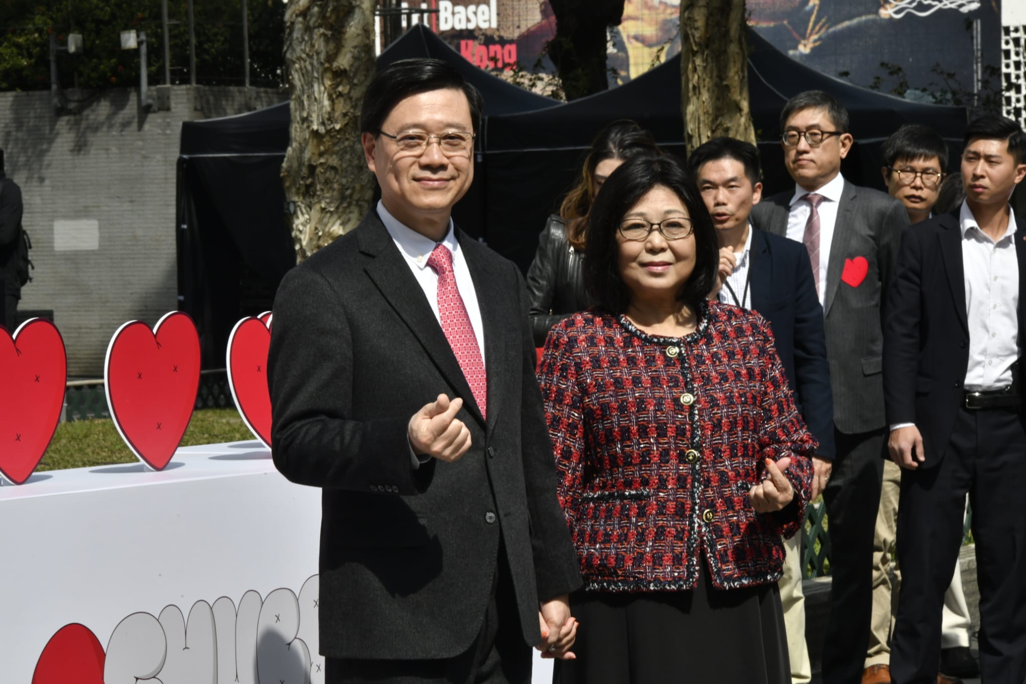 巨型紅心情人節(jié)亮相 李家超偕太太「比心」打卡