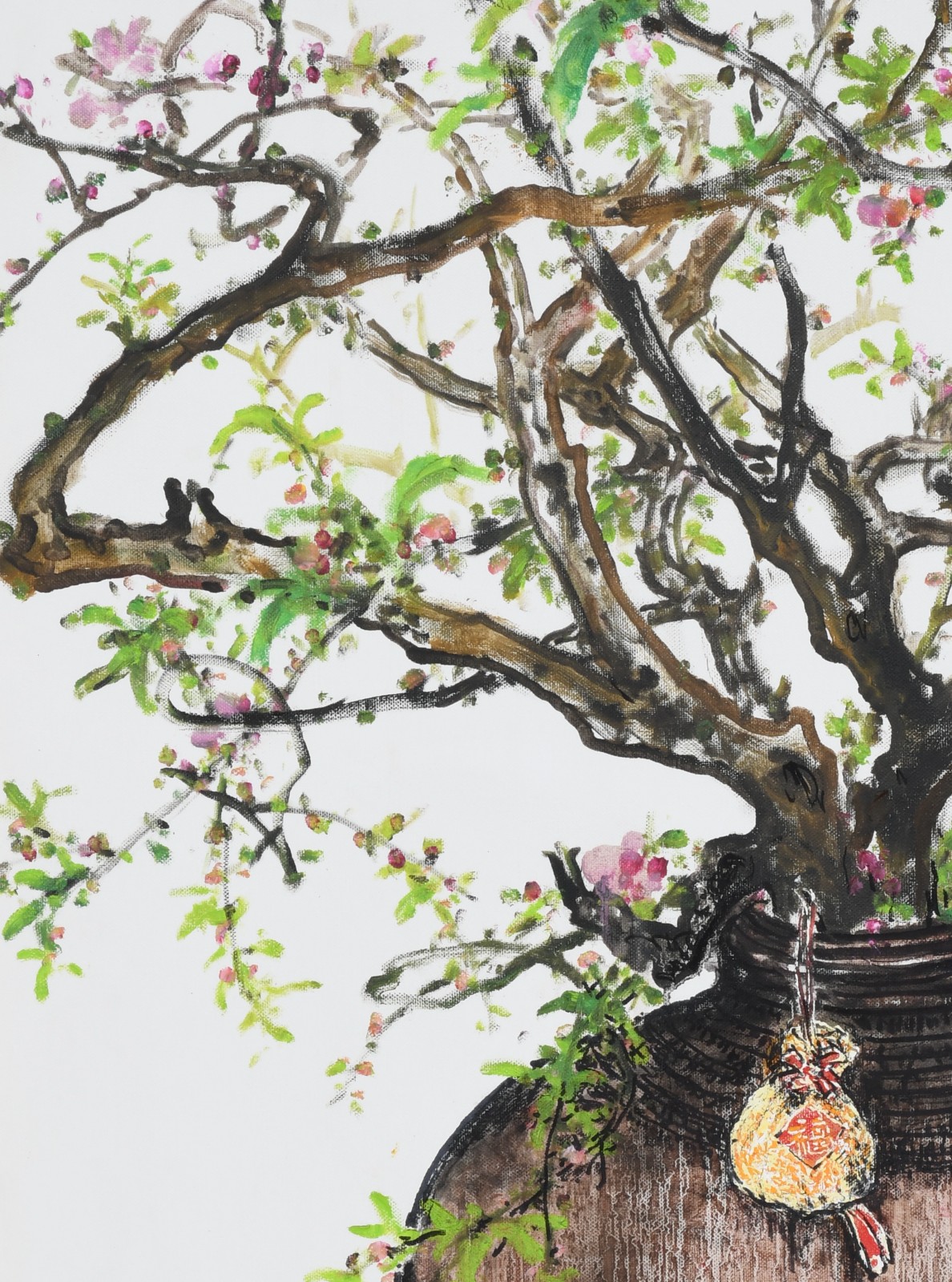 這幅畫採用了「清供圖」的形式,展現(xiàn)出傳統(tǒng)文人精神。此類畫作的內(nèi)容通常為金石、書畫、古器、盆景等文物雅品,蘊含豐富、雅俗共賞,為節(jié)日平添祥和喜慶的氛圍。畫中桃花以盆景的形式出現(xiàn),可供賞玩,充滿文人意趣。瓶中花枝招展,迎春報喜,枝頭掛有一福袋,有祈福納祥之意。蕭教授熱愛傳統(tǒng)書畫,他透過油畫這種西方的載體,以新穎的方式描繪中國傳統(tǒng)的題材,從中表現(xiàn)出濃郁的文人畫風(fēng)格,令傳統(tǒng)文化煥發(fā)出時代的光彩,在創(chuàng)新中發(fā)展,在發(fā)展中繼承。