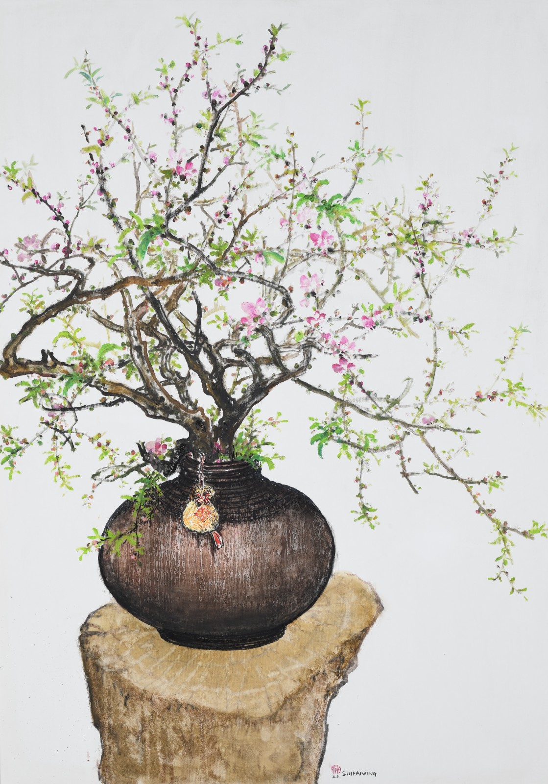 此畫描繪木墩上的花瓶插著一株盛開的桃花,筆觸細膩,構(gòu)圖嚴(yán)謹(jǐn),展現(xiàn)了獨特的藝術(shù)魅力。畫中桃花主幹粗壯蒼勁,枝條盤曲如龍,老幹新枝自由舒展,枝頭朵朵桃花爭相綻放,交錯分布,嬌姿妍態(tài)畢呈,氣韻生動,猶如優(yōu)雅的舞者,以輕盈的姿態(tài)靈動於畫布上,呈現(xiàn)出一種清新亮麗的美感,令人心曠神怡。
