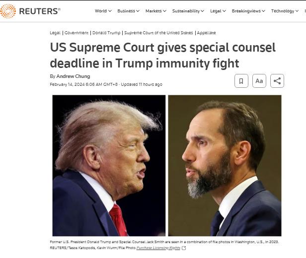 據(jù)路透社報(bào)道,當(dāng)?shù)貢r(shí)間13日,美國聯(lián)邦最高法院下令,針對共和黨籍前總統(tǒng)特朗普所提關(guān)聯(lián)其總統(tǒng)豁免權(quán)的上訴,司法部特別檢察官傑克·史密斯應(yīng)在2月20日前做出回應(yīng)。