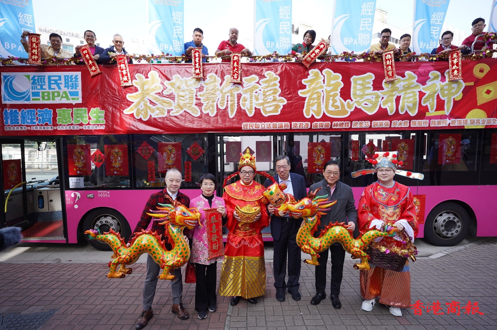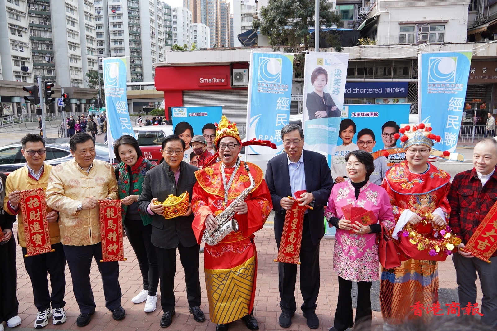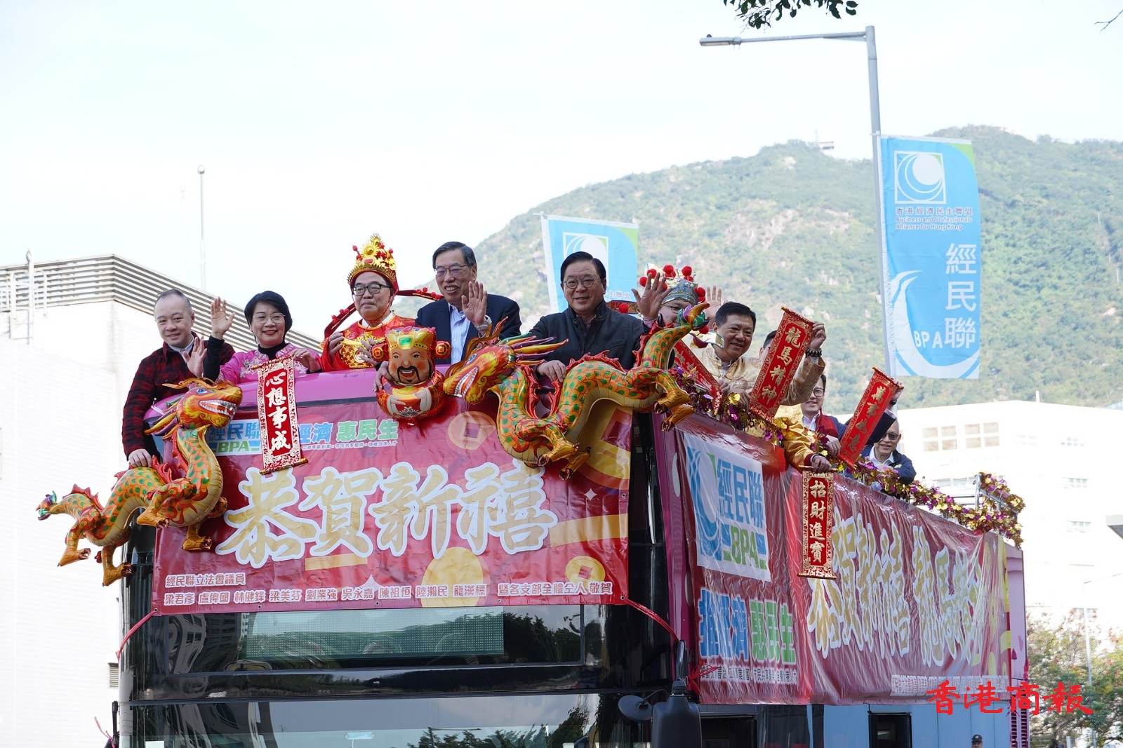 經(jīng)民聯(lián)賀年花車於儀式後,在港島、九龍及新界各區(qū)巡遊,沿途向市民拜年。經(jīng)民聯(lián)成員在中環(huán)、尖沙咀、黃埔、大埔和美孚等站向街坊派發(fā)朱古力金幣利是,祝願香港市民在新一年萬事如意。由盧偉國扮演的財神大受歡迎,爭相向「財神」接利是和合照,他更出動「鑽石色士風(fēng)」,為街坊吹奏賀年樂曲。(記者馮俊文攝)