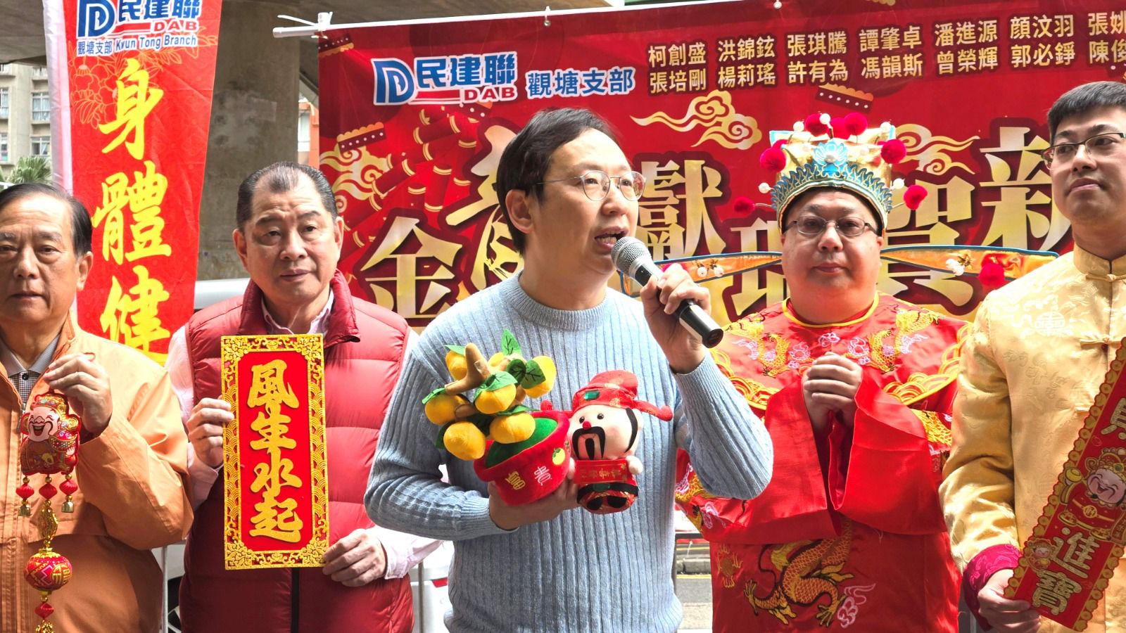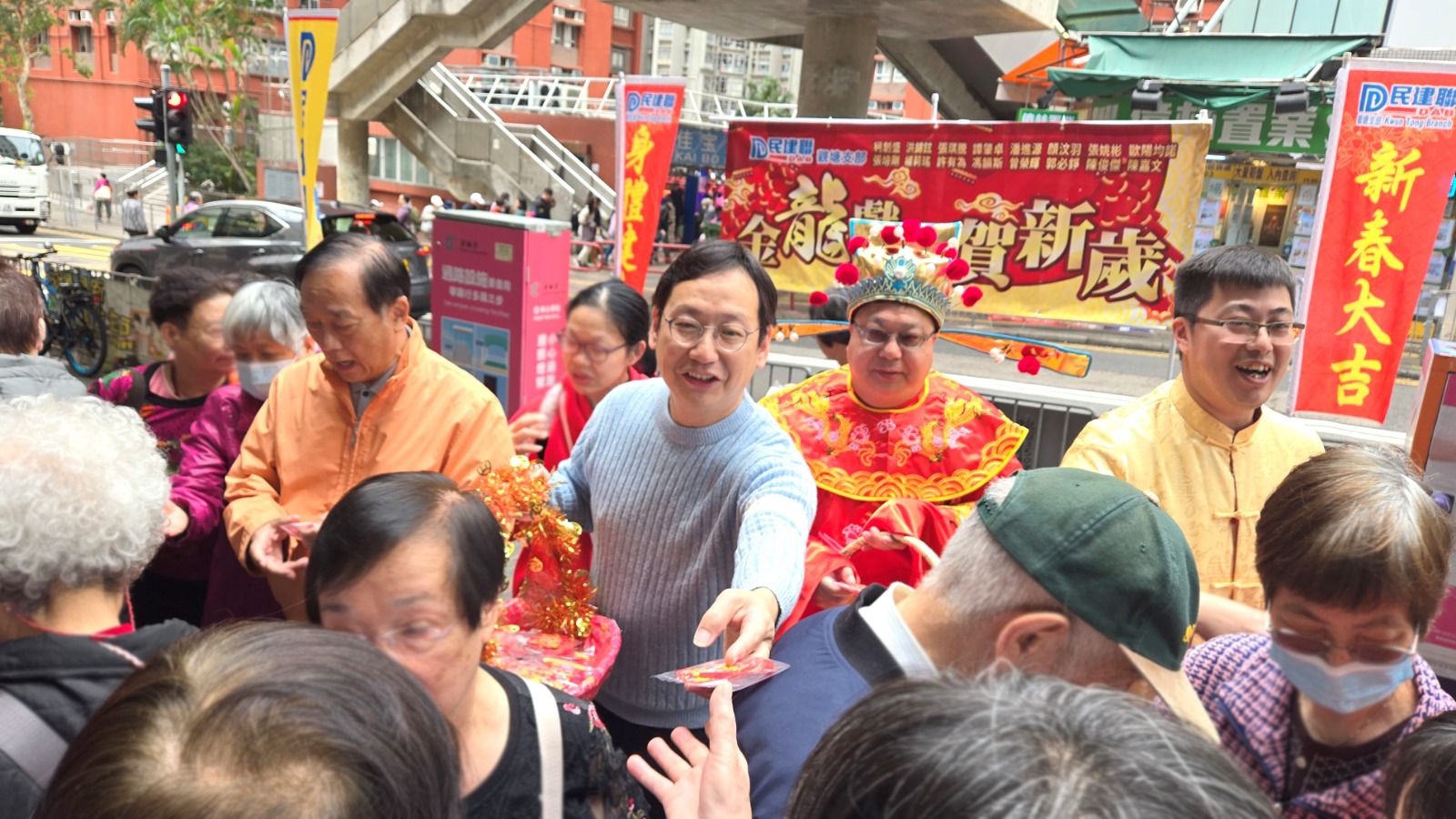 為迎接甲辰龍年,民建聯(lián)觀塘支部今日(19日) 舉行「金龍獻(xiàn)瑞賀新歲」花車巡遊,在「財(cái)神」陪同下民建聯(lián)多名議員及支部委員以花車代步,巡遊觀塘各區(qū)向市民拜年,並途經(jīng)5個(gè)站點(diǎn),包括藍(lán)田啟田商場(chǎng)、油塘高翔苑、秀茂坪商場(chǎng)、樂(lè)華邨巴士站以及觀塘港鐵站A出口,沿途巿民興奮地迎接「財(cái)神」派發(fā)的「利是」,希望迎接好運(yùn),祈望新一年行運(yùn)一條龍;民建聯(lián)仝人亦祝願(yuàn)香港經(jīng)濟(jì)蓬勃發(fā)展、百業(yè)興旺。