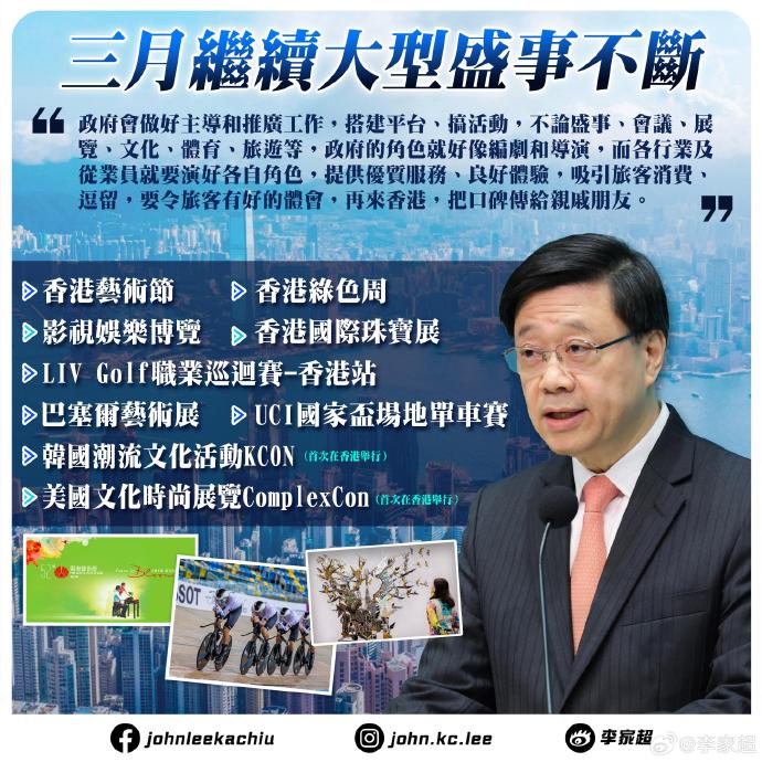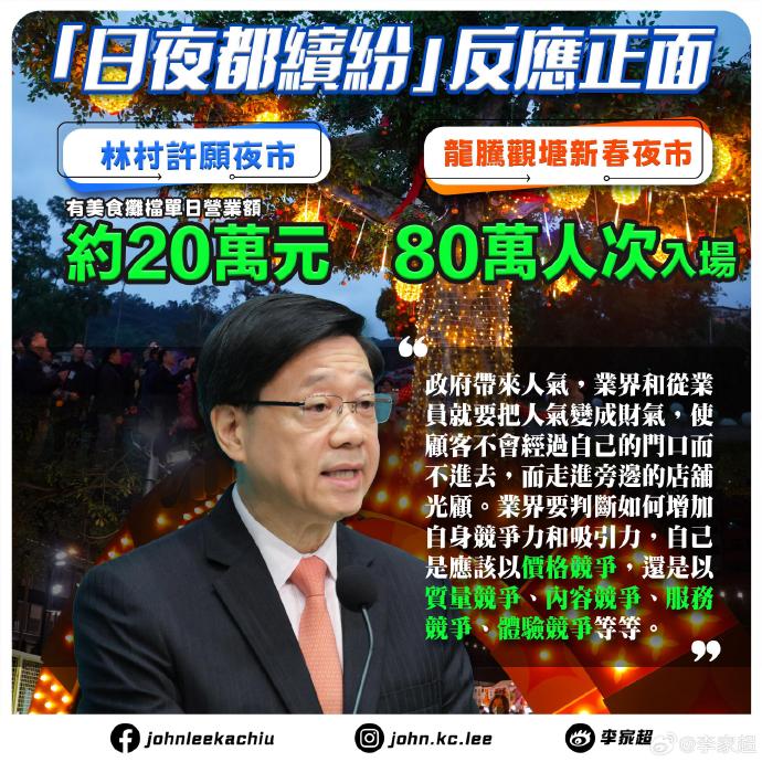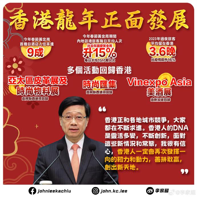 今日(20日),行政長官李家超在社交平臺發(fā)文指,龍年一開始,香港多方面的正面發(fā)展——內(nèi)地春節(jié)黃金周訪港旅客人上升、酒店入住率理想;去年旅客過夜的日數(shù)增加;因疫情轉(zhuǎn)至其他地方舉行的活動回歸香港;未來一個月會有多項盛事繼續(xù)舉行;全港18區(qū)「日夜都繽紛」一系列活動成功帶動市面氣氛,商戶及市民反應(yīng)正面。
