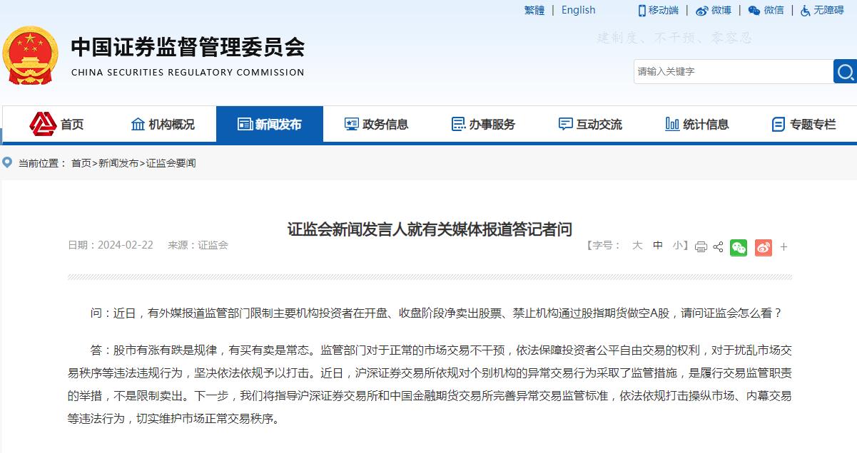 有記者問:近日,有外媒報(bào)道監(jiān)管部門限制主要機(jī)構(gòu)投資者在開盤、收盤階段淨(jìng)賣出股票、禁止機(jī)構(gòu)通過股指期貨做空A股,請(qǐng)問證監(jiān)會(huì)怎麼看?
