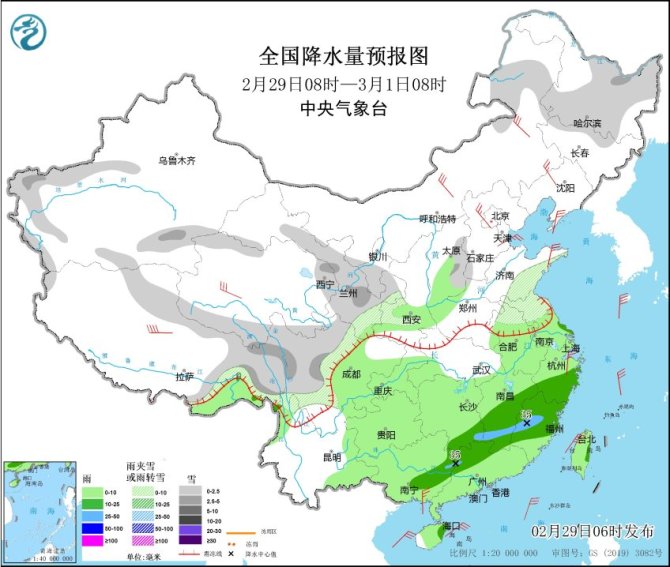 中央氣象臺網(wǎng)站2月29日消息,過去一天,全國雨雪逐漸發(fā)展增強(qiáng),北方大部以降雪為主,集中在西北地區(qū)東部、內(nèi)蒙古、山西、山東和東北三省等地;南方地區(qū)雨水範(fàn)圍明顯擴(kuò)大,江蘇、上海、浙江、安徽南部、江西中北部、湖南中南部、廣西北部等地部分地區(qū)出現(xiàn)中到大雨,今天凌晨起,蘇皖北部出現(xiàn)雨轉(zhuǎn)雪,江蘇連雲(yún)港、宿遷、徐州等地雪花紛飛,並伴隨低溫和大風(fēng)天氣,體感十分寒冷。