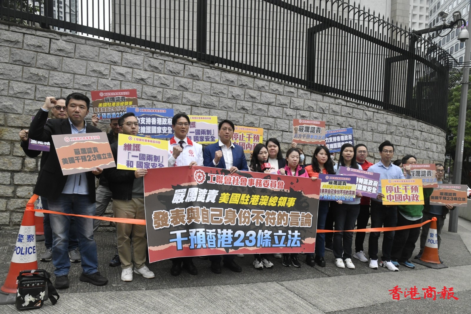 工聯(lián)會(huì)立法會(huì)議員鄧家彪、梁子穎和陳穎欣,聯(lián)同工聯(lián)會(huì)社會(huì)事務(wù)委員會(huì)(社委)及工會(huì)代表一行20多人,今日(7日)下午到美國駐港澳總領(lǐng)事館抗議,強(qiáng)烈譴責(zé)美國駐港澳總領(lǐng)事攻擊抹黑香港國安法和23條立法,干預(yù)特區(qū)政府維護(hù)國家安全。