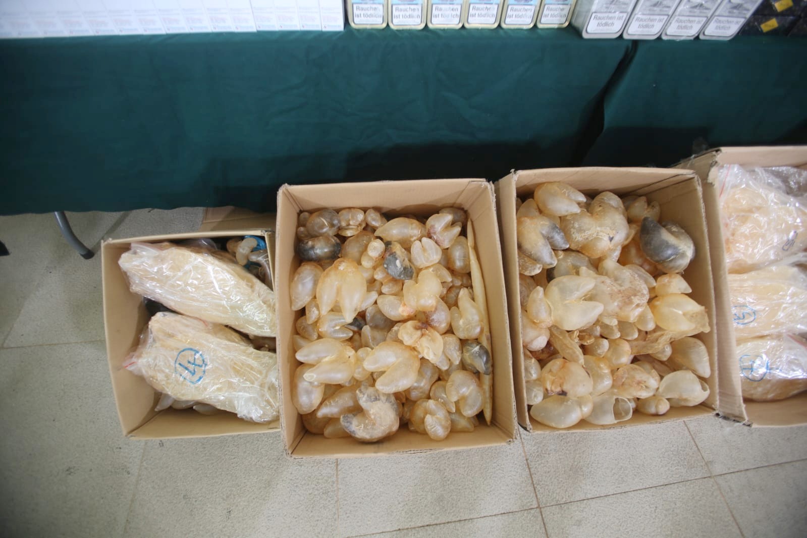 海關(guān)跨境橋岸科港珠澳大橋貨物組張廣穎督察今日(22日)表示,昨日凌晨在港珠澳大橋香港口岸截查一輛貨車,報稱載有12板貨物,約重8000公斤,包括服裝、電子零件和健康食物等。人員檢查時在兩板貨物中發(fā)現(xiàn)一批未列倉單物品,包括乾魚肚、藥劑製品和煙草。經(jīng)調(diào)查後拘捕司機(jī),涉嫌企圖輸出未列倉單貨物。